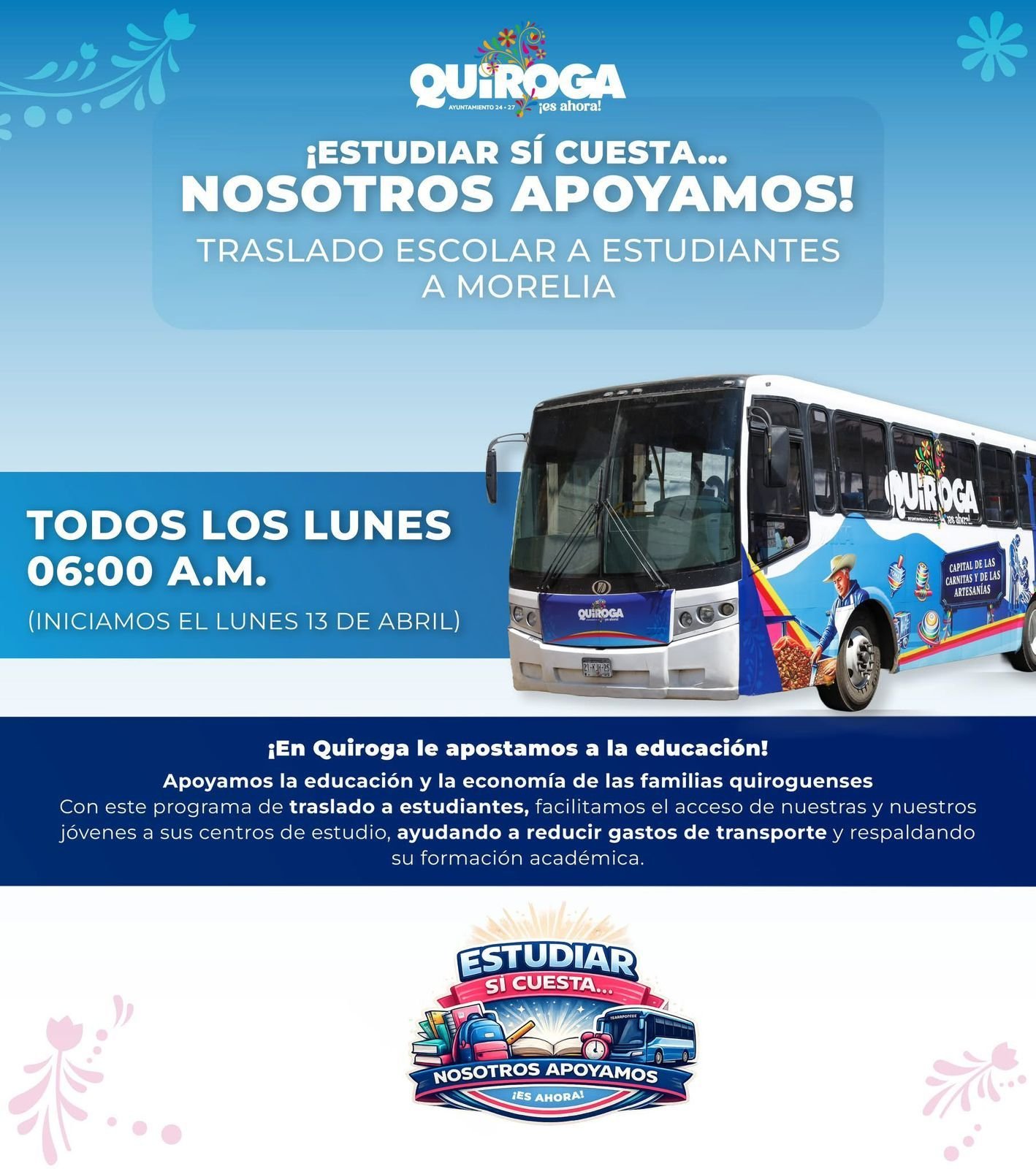 González Sánchez señaló que el programa facilita el acceso de los jóvenes a centros educativos fuera del municipio y reduce los gastos de transporte. El servicio iniciará el lunes 13 de abril, con salidas a las 6:00 de la mañana desde la Presidencia Municipal de Quiroga.