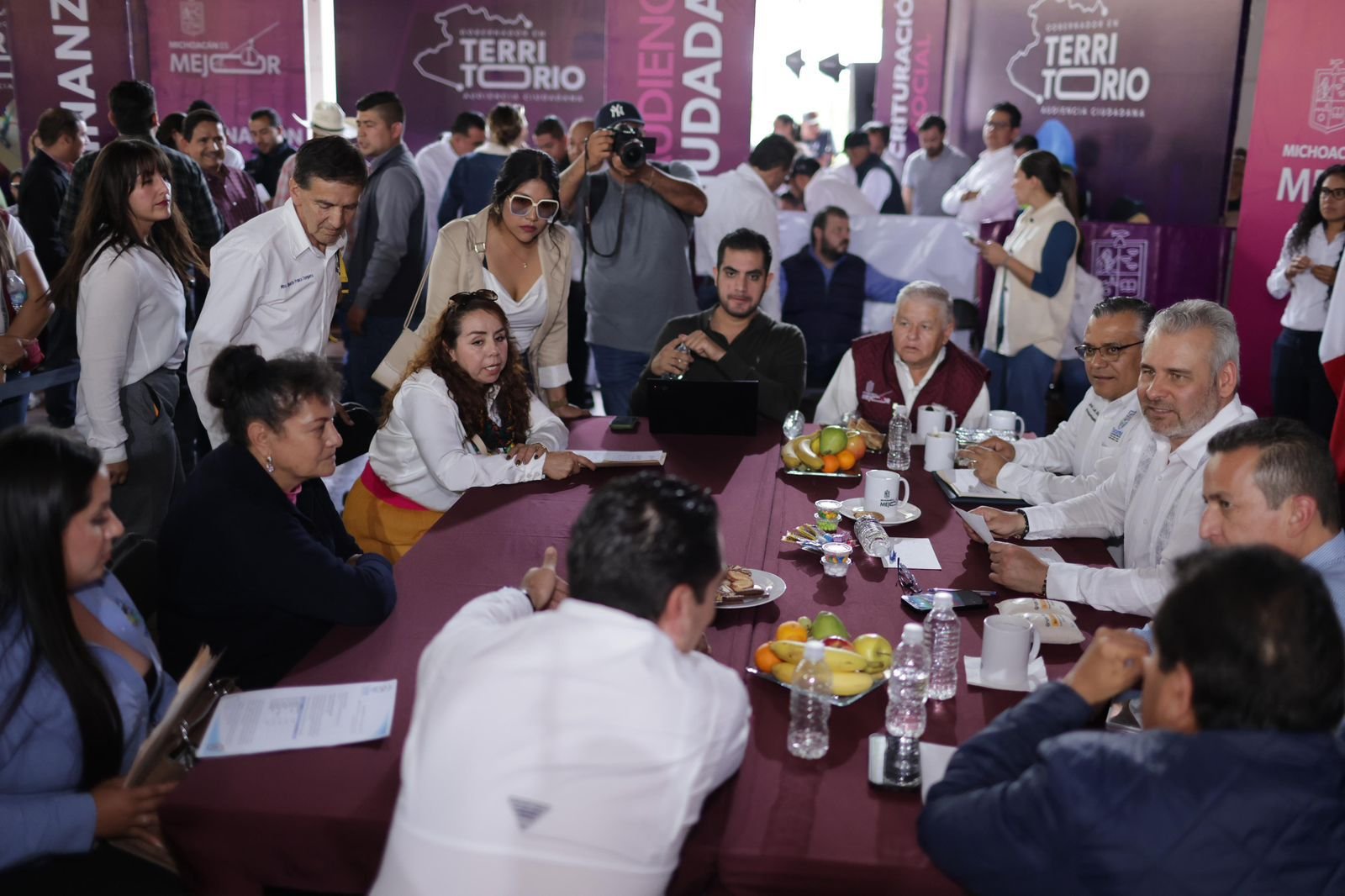 Tocumbo, Michoacán, 12 de diciembre de 2025.— El gobernador Alfredo Ramírez Bedolla encabezó una audiencia pública en Tocumbo donde atendió solicitudes ciudadanas en diversas áreas, incluyendo infraestructura y equipamiento educativo, así como rehabilitación carretera.