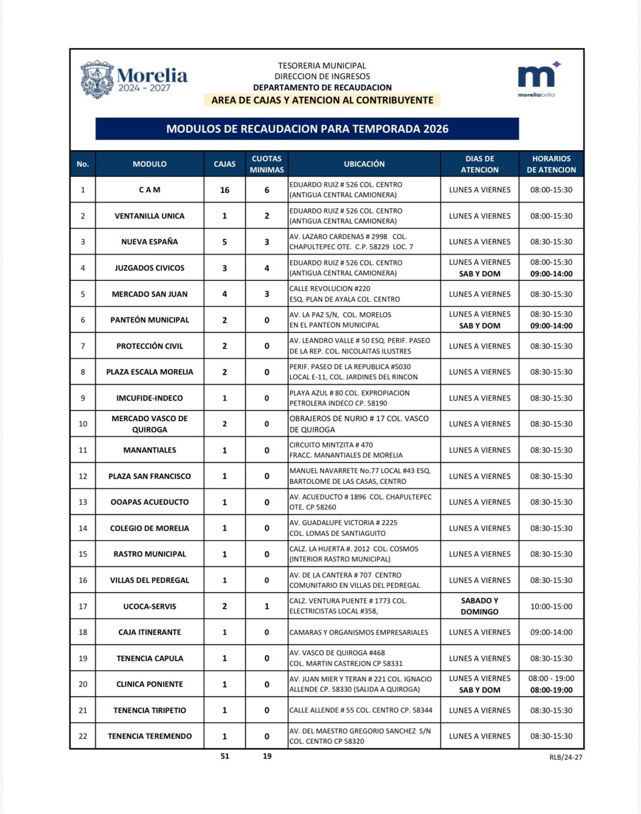​La infraestructura de cobro presencial operará principalmente en el CAM, ubicado en la calle Eduardo Ruiz 570, en un horario de 08:00 a 15:30 horas de lunes a viernes. Con el fin de acercar los servicios a las zonas de mayor densidad poblacional y comunidades alejadas, se instalaron ventanillas de atención en el fraccionamiento Villas del Pedregal, así como en las tenencias de Capula, Teremendo y Tiripetío. Para quienes requieran realizar el trámite durante los fines de semana, la plaza comercial “Ucoca Servis” brindará servicio de 10:00 a 15:00 horas, mientras que la Clínica Municipal Poniente mantendrá atención diaria, incluidos sábados y domingos, de 08:00 a 19:00 horas.