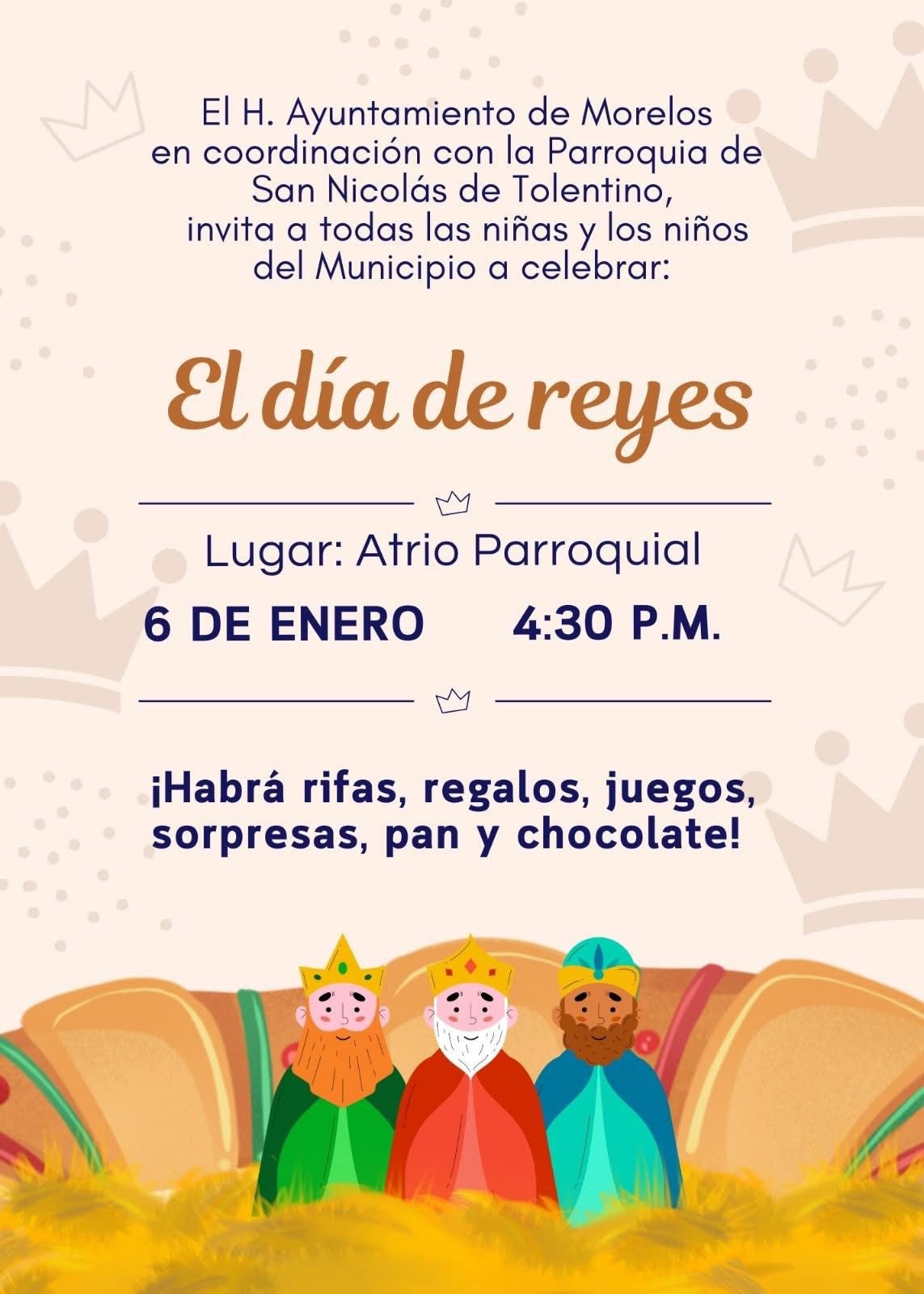 Villa Morelos, Michoacán, 5 de enero de 2026.– El presidente municipal, Julio César Conejo Alejos, en coordinación con la Parroquia de San Nicolás de Tolentino, invitó a las familias del municipio a participar en el festejo tradicional del Día de Reyes. El evento se llevará a cabo el próximo 6 de enero con el objetivo de preservar las costumbres locales y fortalecer la convivencia comunitaria entre la niñez morelense.
