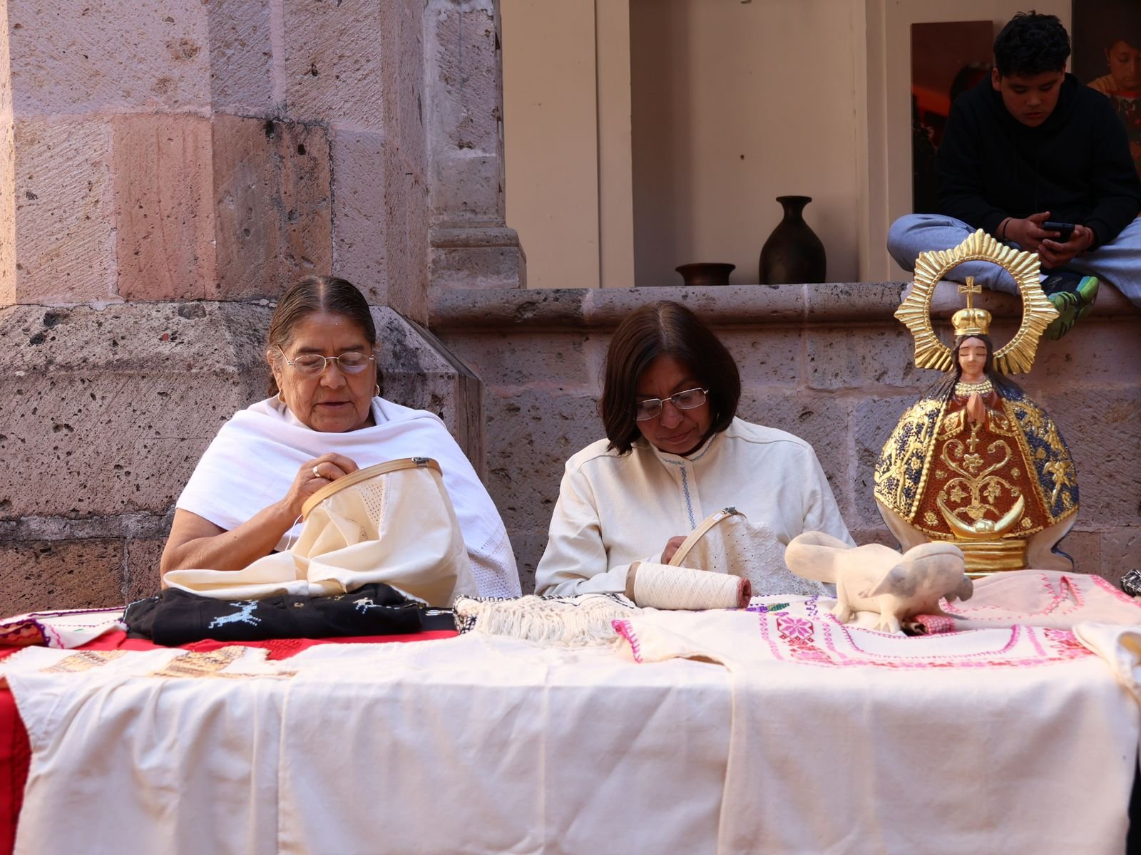 La artesana textil María del Carmen Ansiosa Horta invitó al público a visitar Tócuaro, destacando la oferta de piezas en manta con bordados y deshilados artesanales. Los precios varían desde 700 pesos por diseños sencillos hasta más de 1,800 pesos por prendas con detalles elaborados.