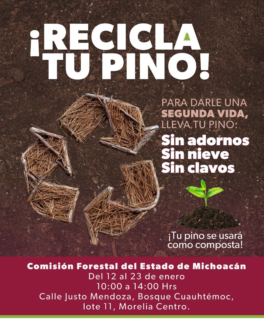 Morelia, Michoacán, 8 de enero de 2026.– La Comisión Forestal de Michoacán (Cofom) invita a la ciudadanía a participar en la campaña de reciclaje de árboles de Navidad, la cual se realizará del 12 al 23 de enero. La directora de la dependencia, Martha Beatriz Rendón López, informó que el objetivo de esta iniciativa es transformar los ejemplares en composta y abono orgánico para la regeneración de suelos forestales. La recepción de los pinos se llevará a cabo en las instalaciones de la institución, ubicadas en el Bosque Cuauhtémoc, de lunes a viernes en un horario de 10:00 a 14:00 horas.