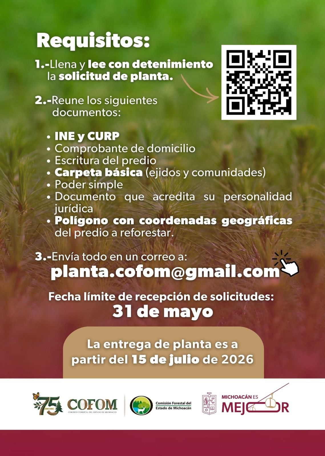 Morelia, Michoacán, 9 de febrero de 2026.– La Comisión Forestal de Michoacán (Cofom) informó que está abierta la recepción de solicitudes para la entrega gratuita de plantas destinadas a la restauración de suelos forestales. La convocatoria estará vigente hasta el 31 de mayo de 2026, según un comunicado de la dependencia.