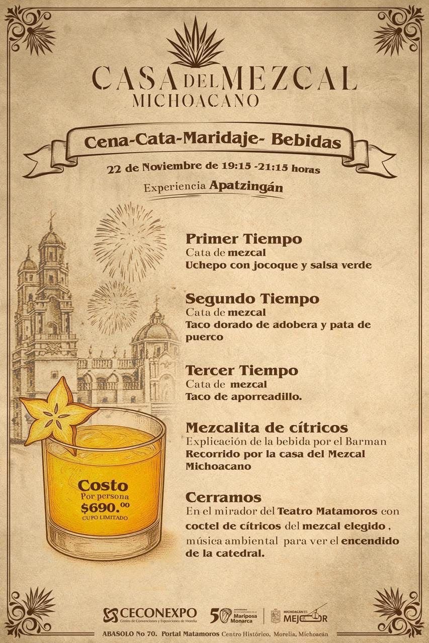 Morelia, Michoacán, 18 de noviembre del 2025.— La Casa del Mezcal Michoacano, gestionada por el Centro de Convenciones y Exposiciones de Morelia (Ceconexpo), presentará un evento exclusivo denominado Cena–Cata–Maridaje.