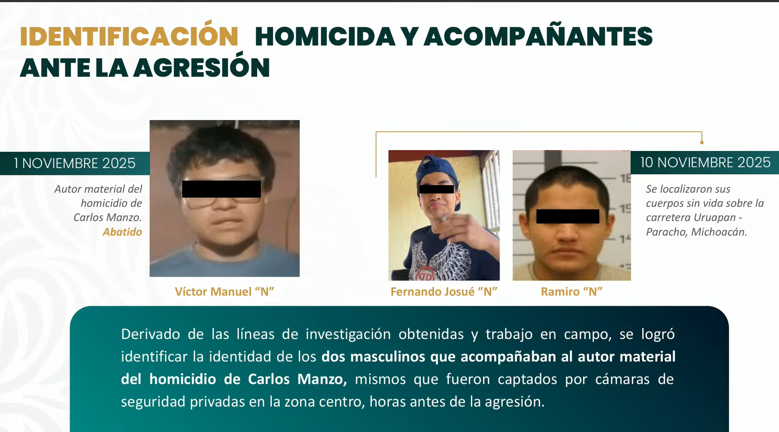 - Otros Implicados: Las investigaciones posteriores localizaron los cuerpos de otros dos presuntos implicados en la logística del atentado, Fernando Josué “N” y Ramiro “N”, en la carretera Uruapan-Paracho.
