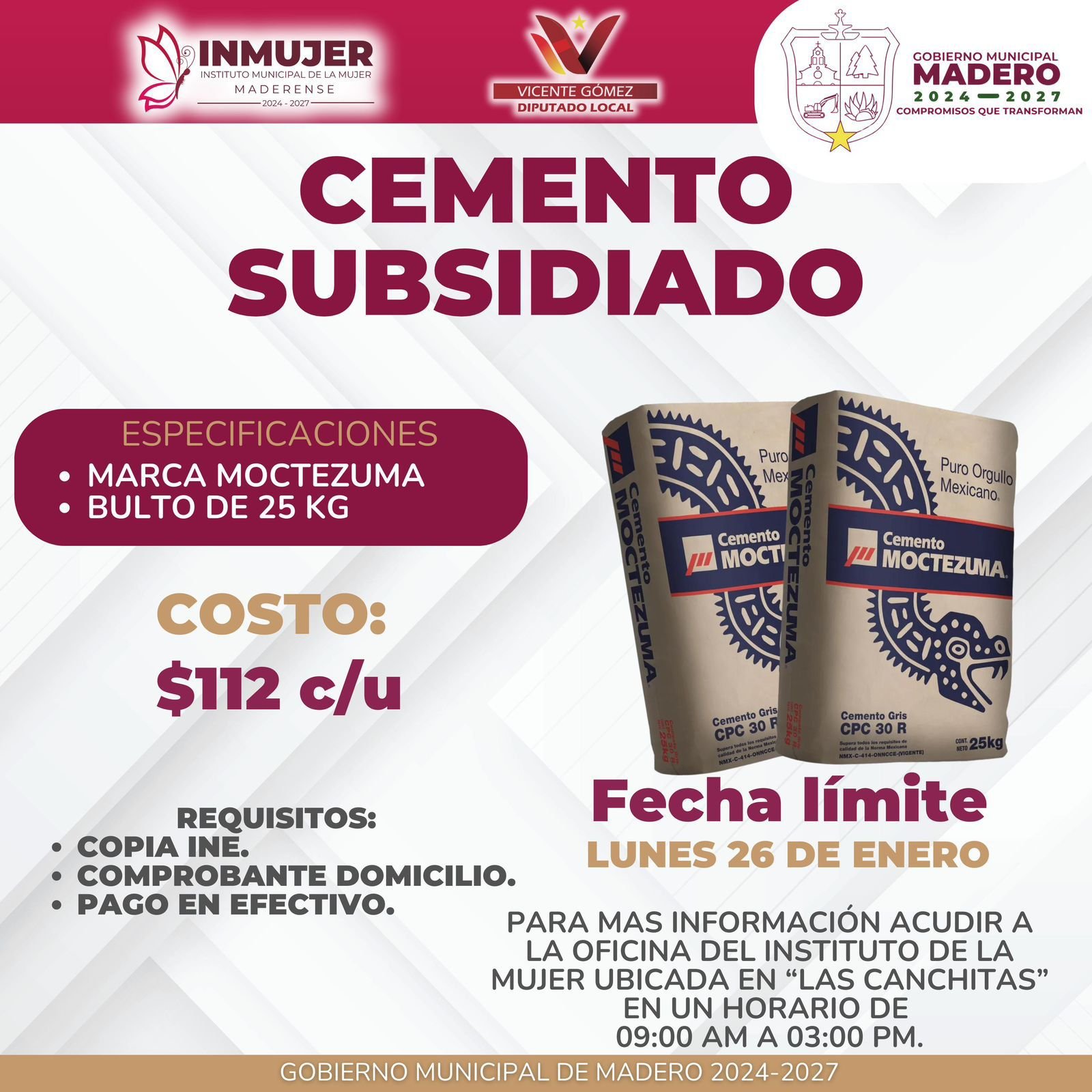 Morelia, Michoacán, 23 de enero de 2026.– El diputado por el Distrito XIX con sede en Tacámbaro, Vicente Gómez Núñez, informó que está abierta la ventanilla para el Programa de Cemento subsidiado, puesto en marcha en coordinación con el Ayuntamiento de Madero y el Instituto Municipal de la Mujer de este municipio, según un comunicado difundido por el legislador.