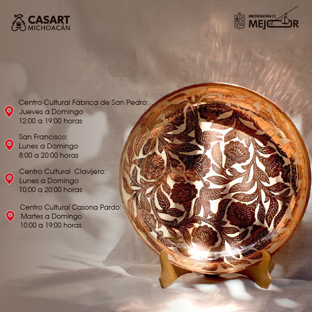 Morelia, Michoacán, 11 de noviembre de 2025.— La Casa de las Artesanías de Michoacán (Casart) se suma a la iniciativa de El Buen Fin ofreciendo descuentos del 5, 10 y 15 por ciento en todas sus piezas artesanales.