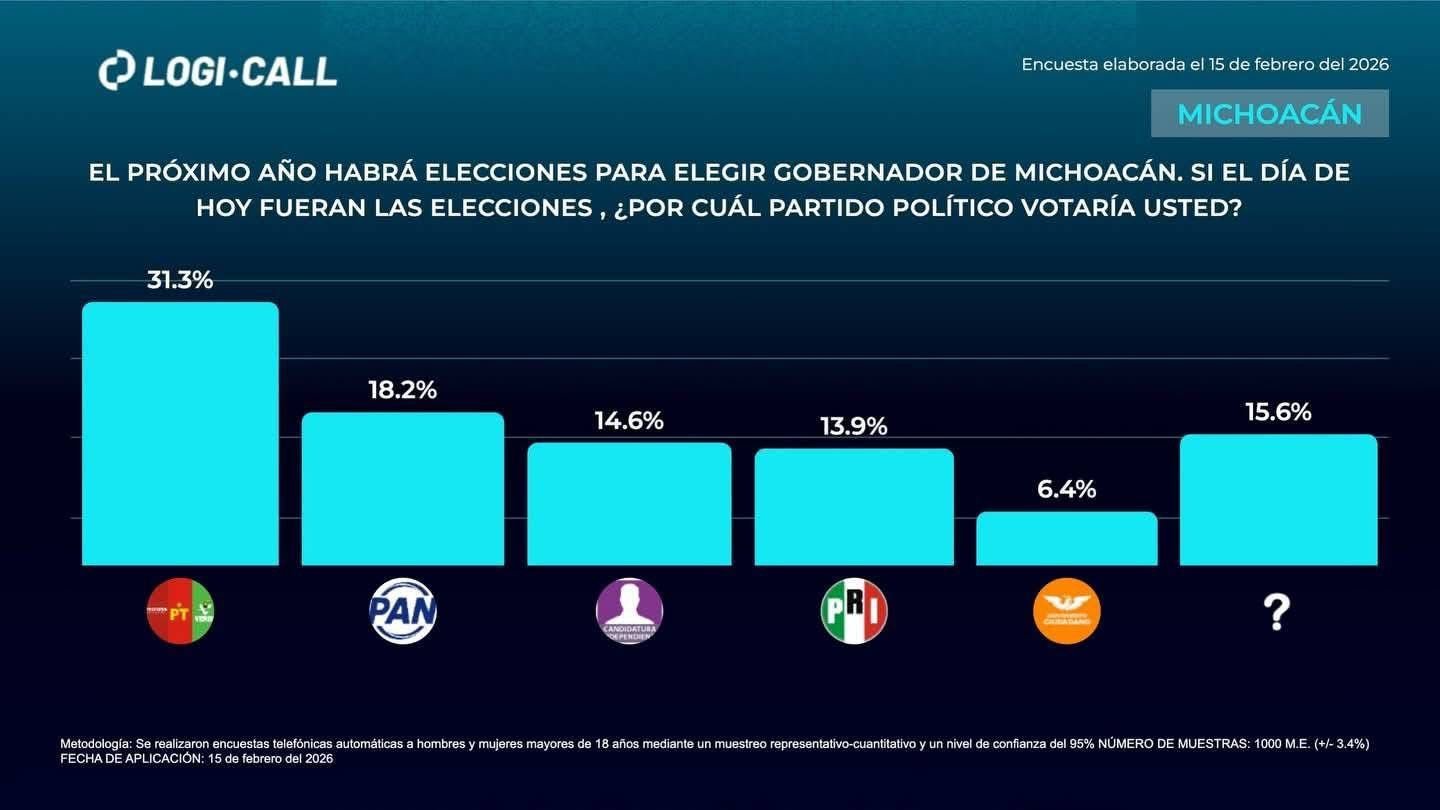 En el panorama general por fuerzas políticas, la coalición encabezada por Morena-PT-PVEM domina el escenario electoral con 31.3% de la intención de voto, por 18.2% del PAN, 13.9% del PRI y 6.4% de Movimiento Ciudadano, de acuerdo con el estudio de Logi-Call.