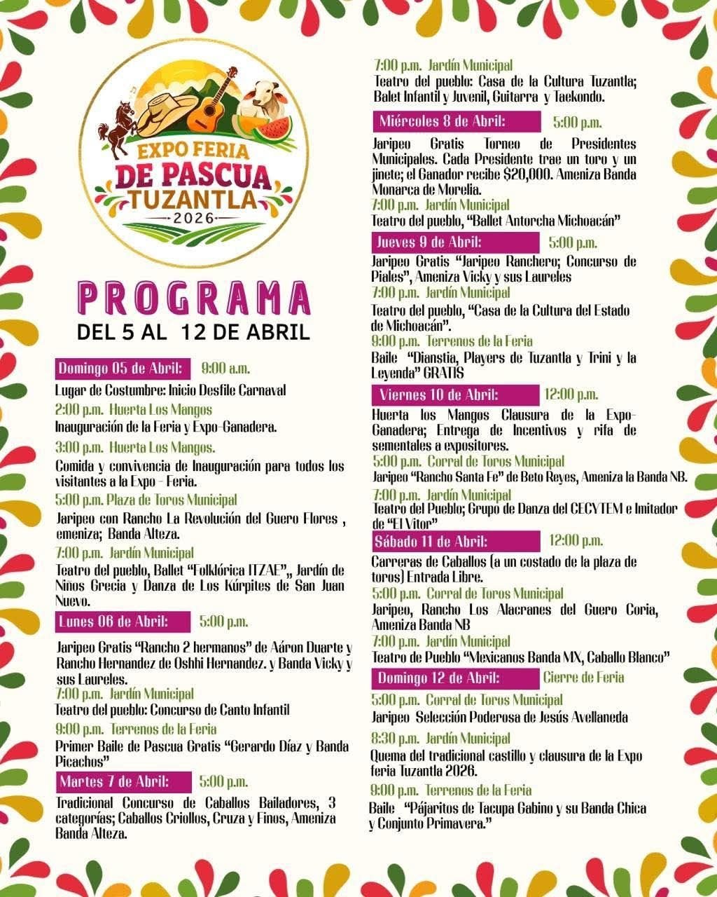 TUZANTLA, MICHOACÁN – El presidente municipal de Tuzantla, Fernando Ocampo Mercado, confirmó oficialmente la realización de la tradicional Expo Feria de Pascua 2026, destacando que para esta edición todos los eventos serán completamente gratuitos. En entrevista, el edil señaló que la celebración se llevará a cabo del 5 al 12 de abril, con una programación diseñada para unir a la comunidad local y atraer a turistas de municipios vecinos y otros estados.