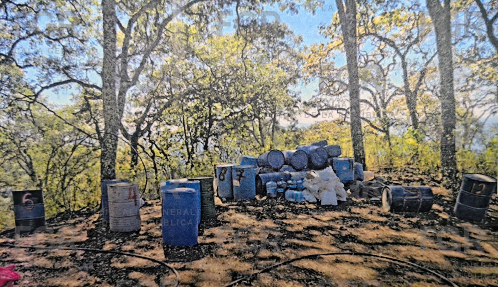 De acuerdo con el comunicado, elementos del Gabinete de Seguridad del Gobierno de México, por conducto de la Secretaría de la Defensa Nacional (Defensa), percibieron un olor a químicos en la zona y procedieron a inspeccionar el lugar, donde localizaron inicialmente 15 tanques de gas, 45 recipientes de plástico vacíos, 25 tambos vacíos, 72 bidones vacíos, dos hornos artesanales, un tinaco de mil 100 litros vacío, 27 bidones de 20 litros con sustancia líquida y 13 costales de 25 kilos con hidróxido de sodio.