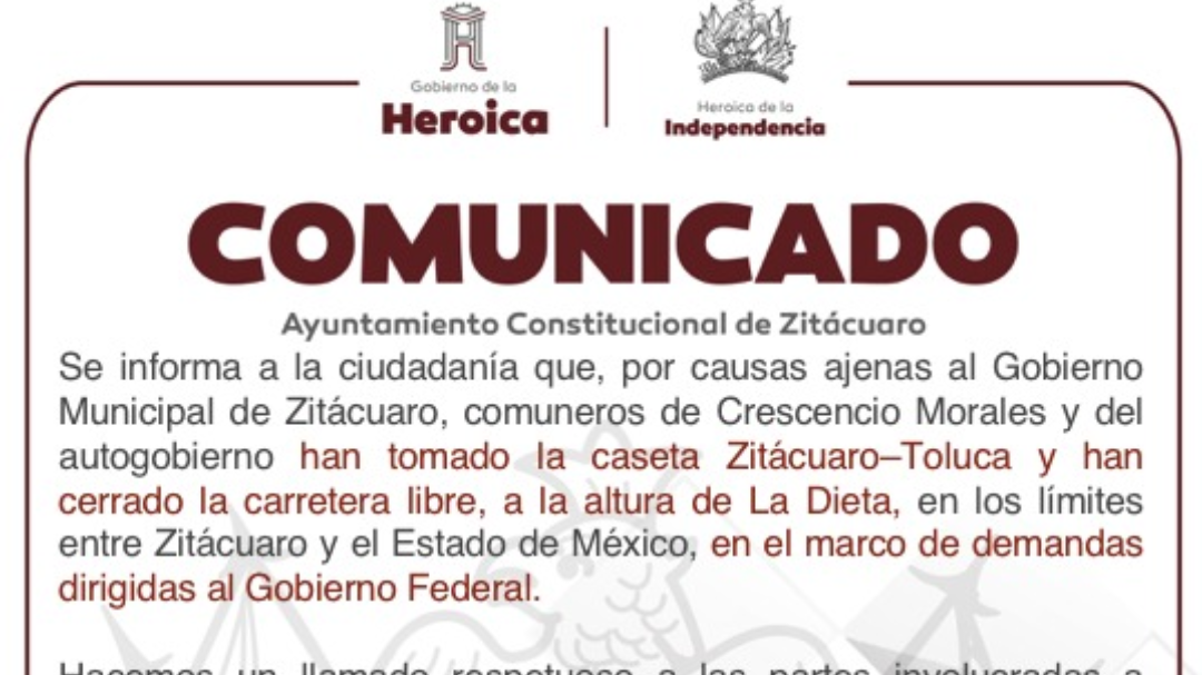 H. Zitácuaro, Michoacán, a 15 de diciembre de 2025.— El Ayuntamiento Constitucional de Zitácuaro emitió un comunicado informando a la ciudadanía sobre el cierre de importantes vías de comunicación, el cual es realizado por comuneros y miembros del autogobierno de Crescencio Morales.