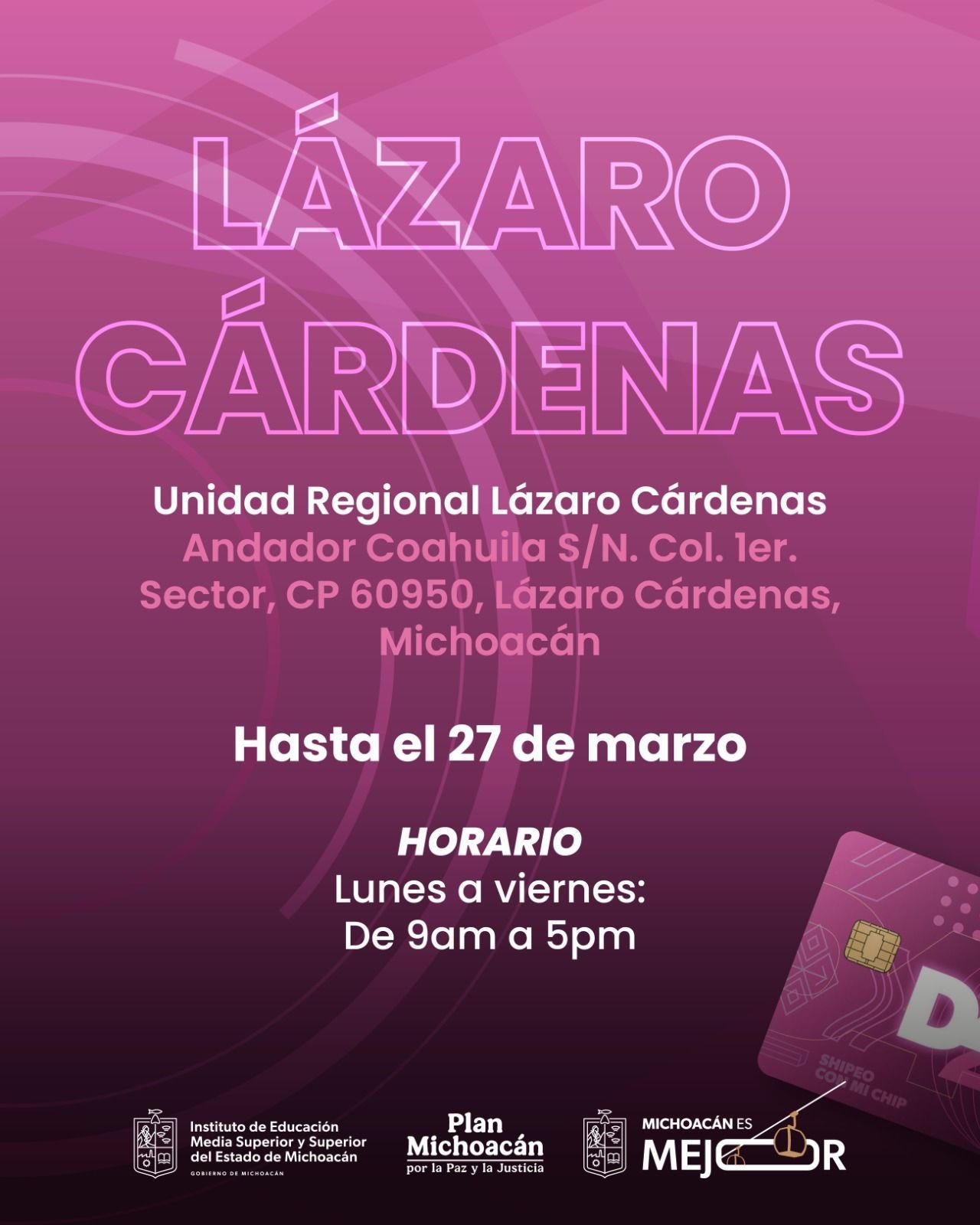 De acuerdo con el Iemsysem, los módulos operan a través de las Unidades Regionales de la Secretaría de Educación del Estado (SEE) hasta el viernes 27 de marzo, en horario de 09:00 a 17:00 horas. En Lázaro Cárdenas, la unidad se ubica en Andador Coahuila S/N, colonia 1er Sector; en Uruapan, en calle Yucatán 9 A, esquina California, colonia Ramón Farías; y en Zamora, en Francisco J. Mújica 597, colonia Jardines de Catedral.