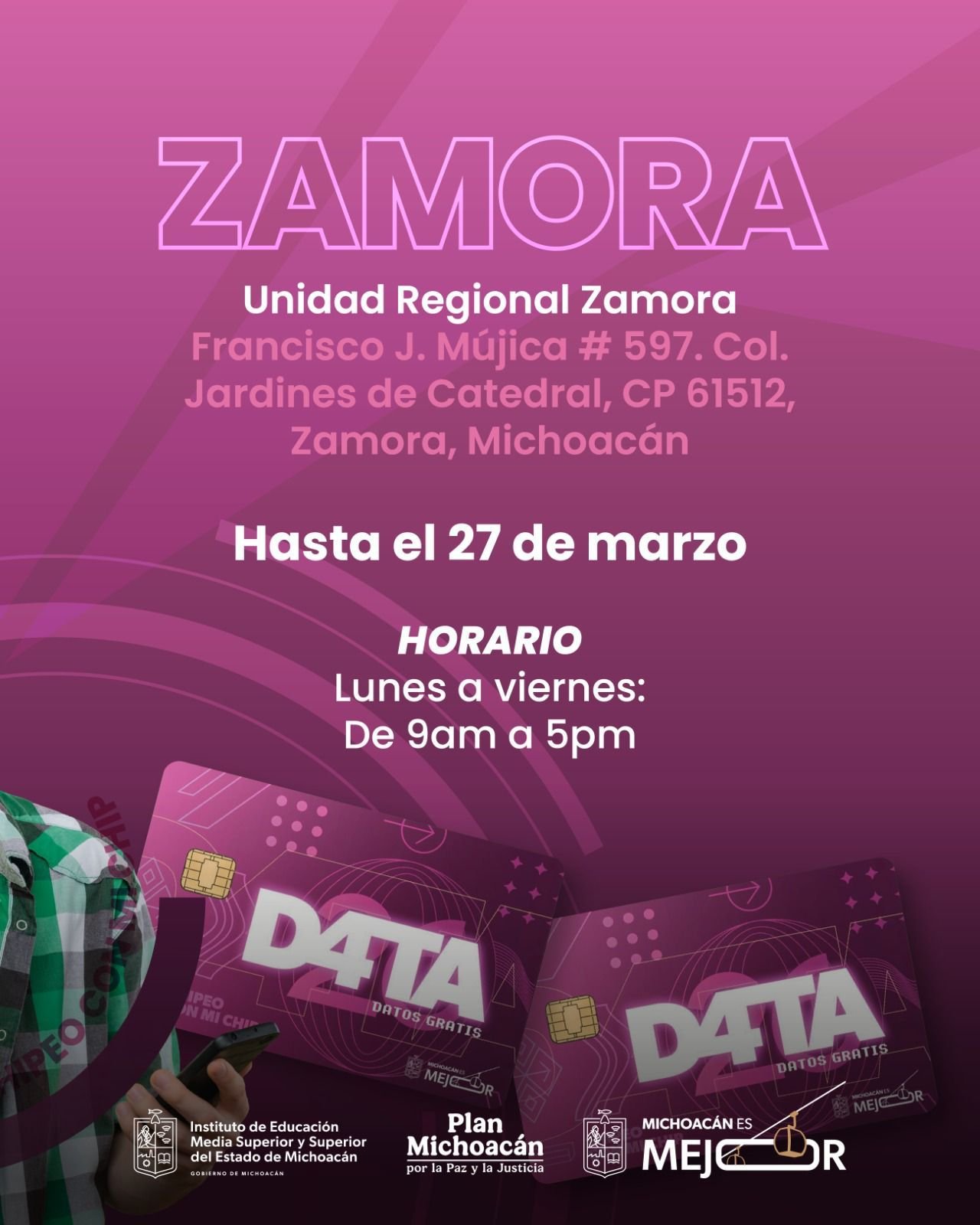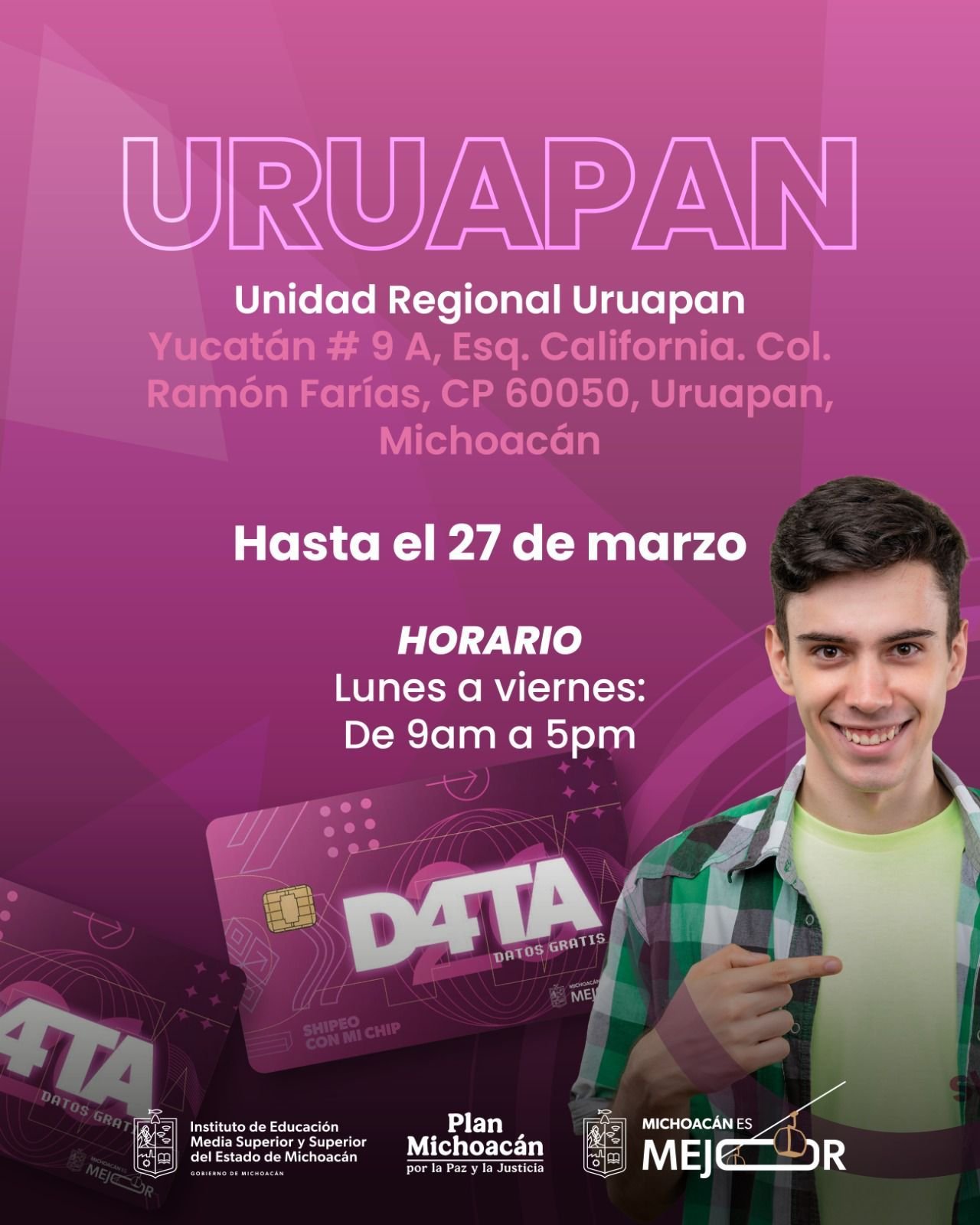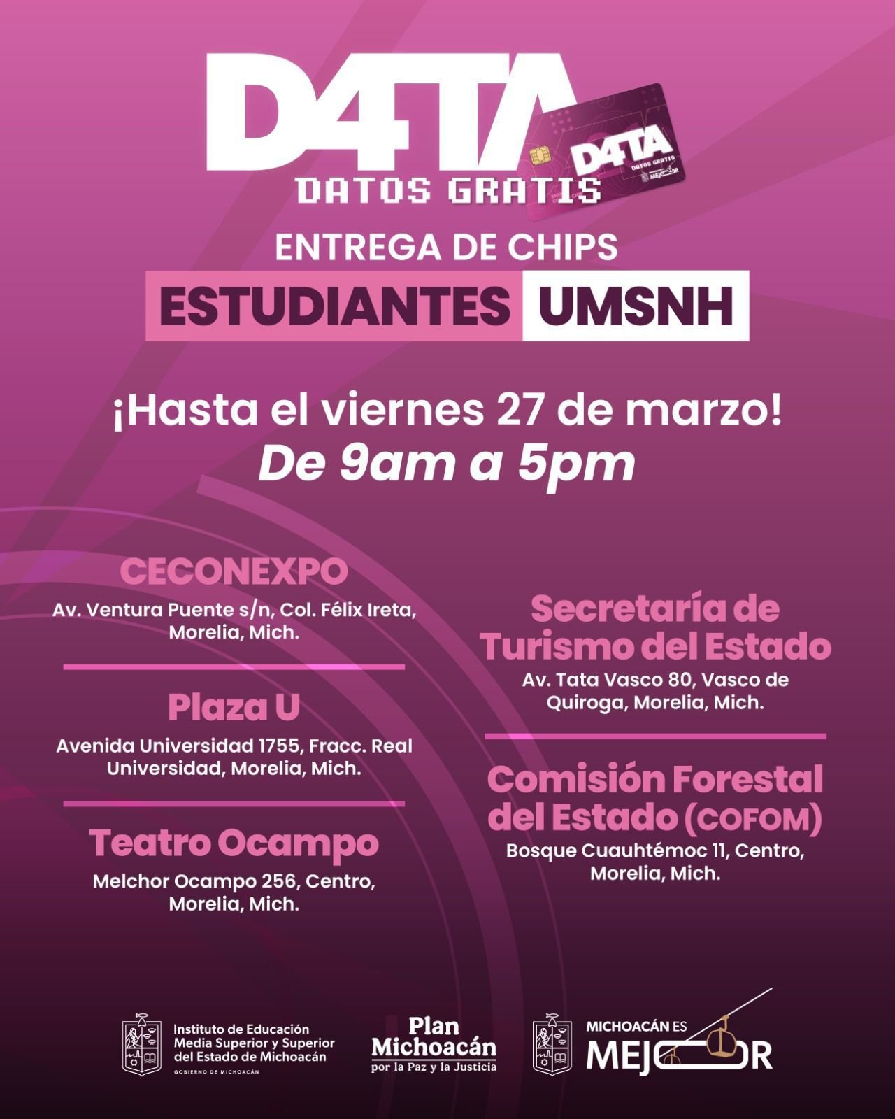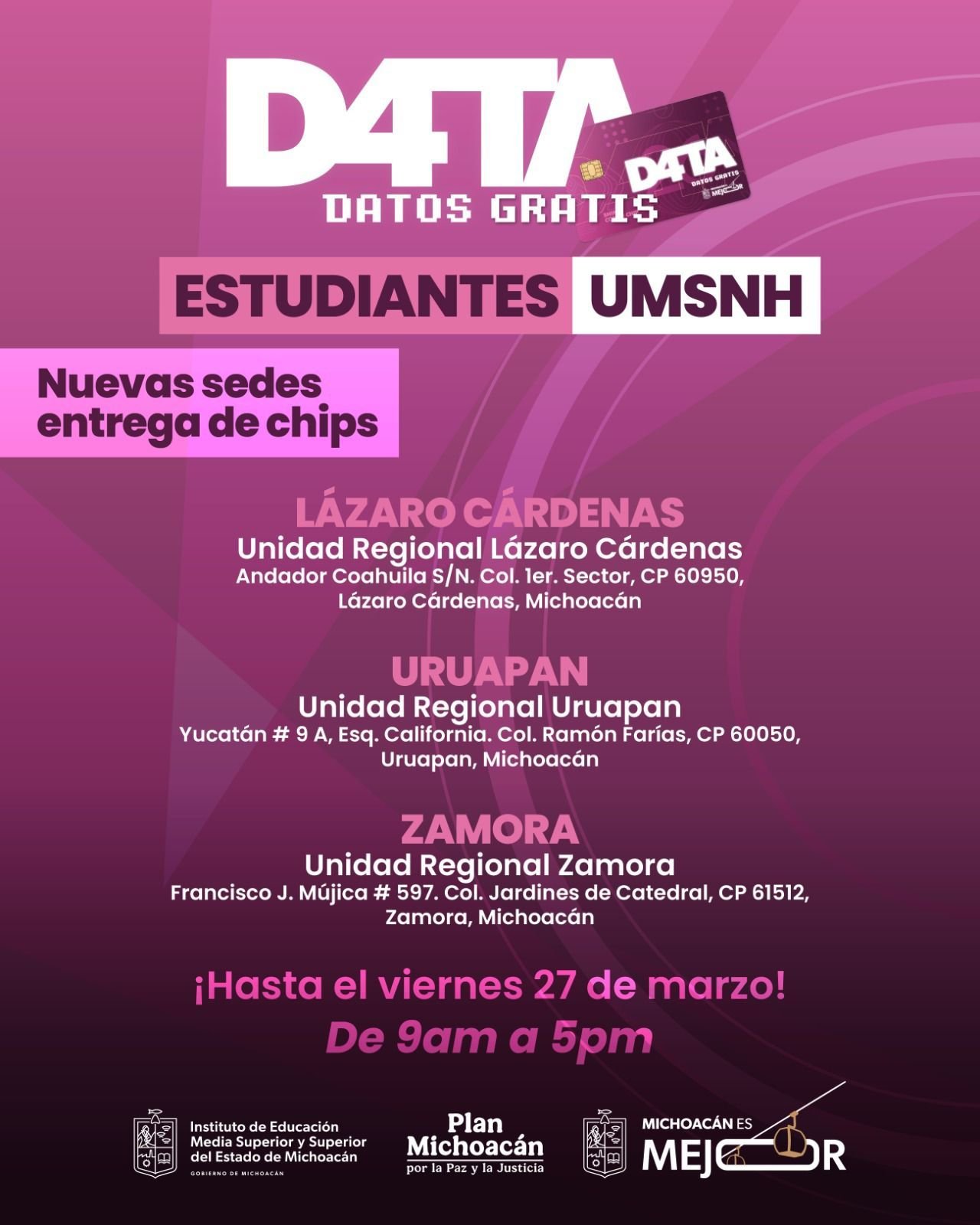 Morelia, Michoacán, 25 de marzo de 2026. El Instituto de Educación Media Superior y Superior del Estado (Iemsysem) informó que se habilitaron módulos de entrega del programa D4TA Datos Gratis en los municipios de Lázaro Cárdenas, Uruapan y Zamora para que estudiantes de la Universidad Michoacana de San Nicolás de Hidalgo (UMSNH) puedan recoger y activar su chip con internet gratuito sin necesidad de trasladarse a la capital.