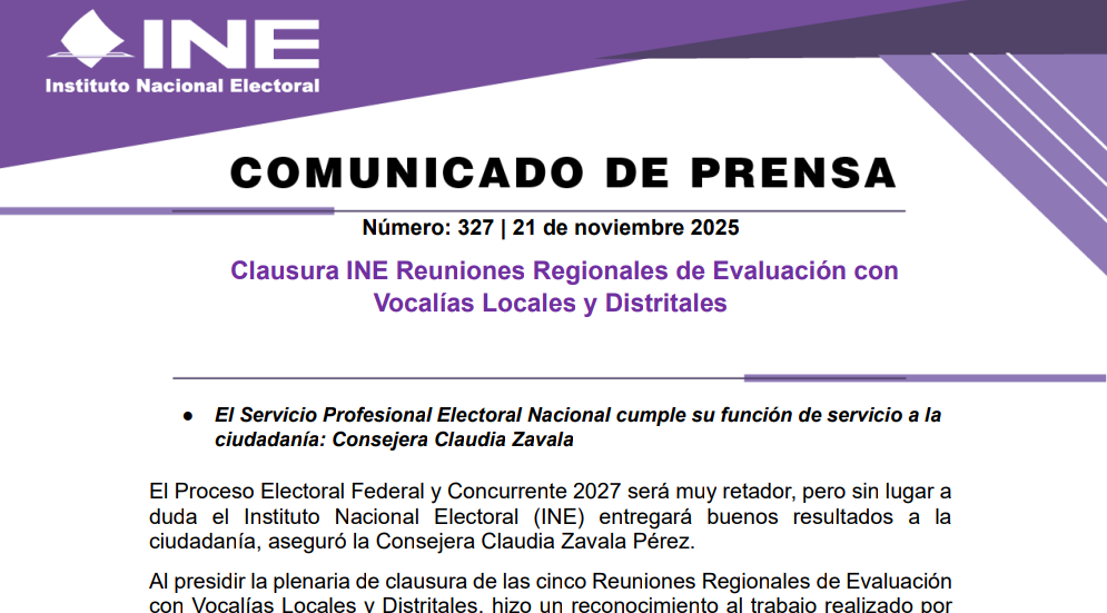 Comunicado Número: 327 | 26 de noviembre de 2025. Ciudad de México, 25 de noviembre de 2025.— El Instituto Nacional Electoral (INE) clausuró las cinco Reuniones Regionales de Evaluación con Vocalías Locales y Distritales, un encuentro clave para revisar los procedimientos operativos, técnicos y normativos de cara a los próximos ciclos electorales 2023-2024 y 2024-2025, y en preparación para los procesos 2026-2027.
