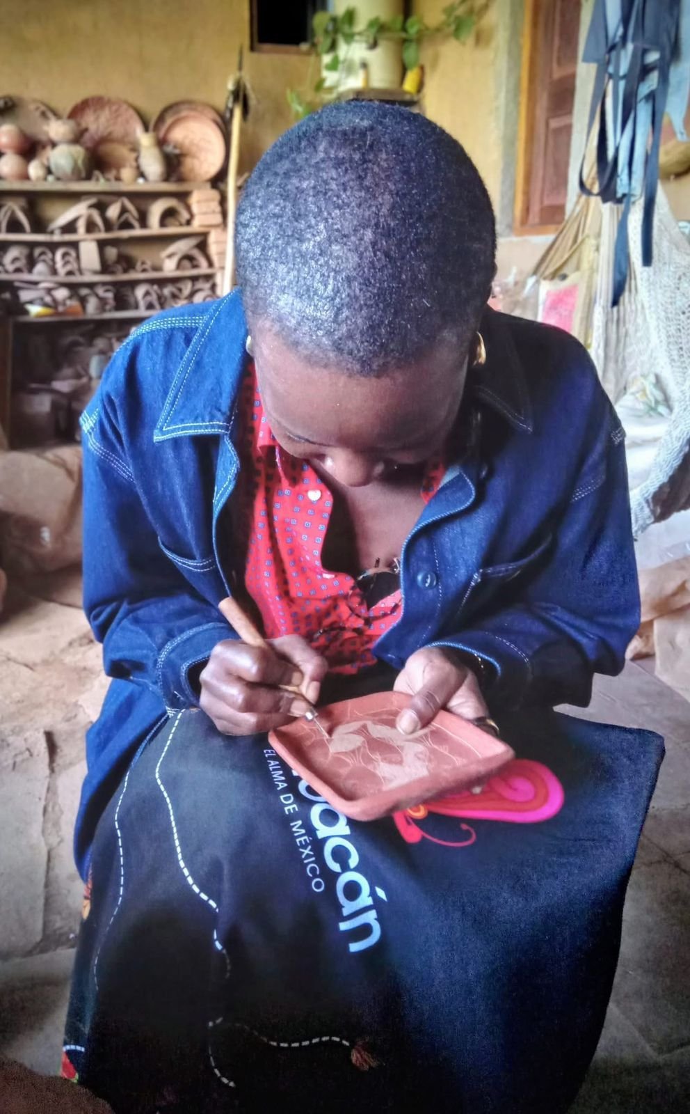 • ​En Santa Fe de la Laguna, visitó el taller “Ahuanda” del maestro Nicolás Fabián Fermín. Allí, Nyong’o participó moldeando el barro y aprendió las técnicas ancestrales de la alfarería purépecha.