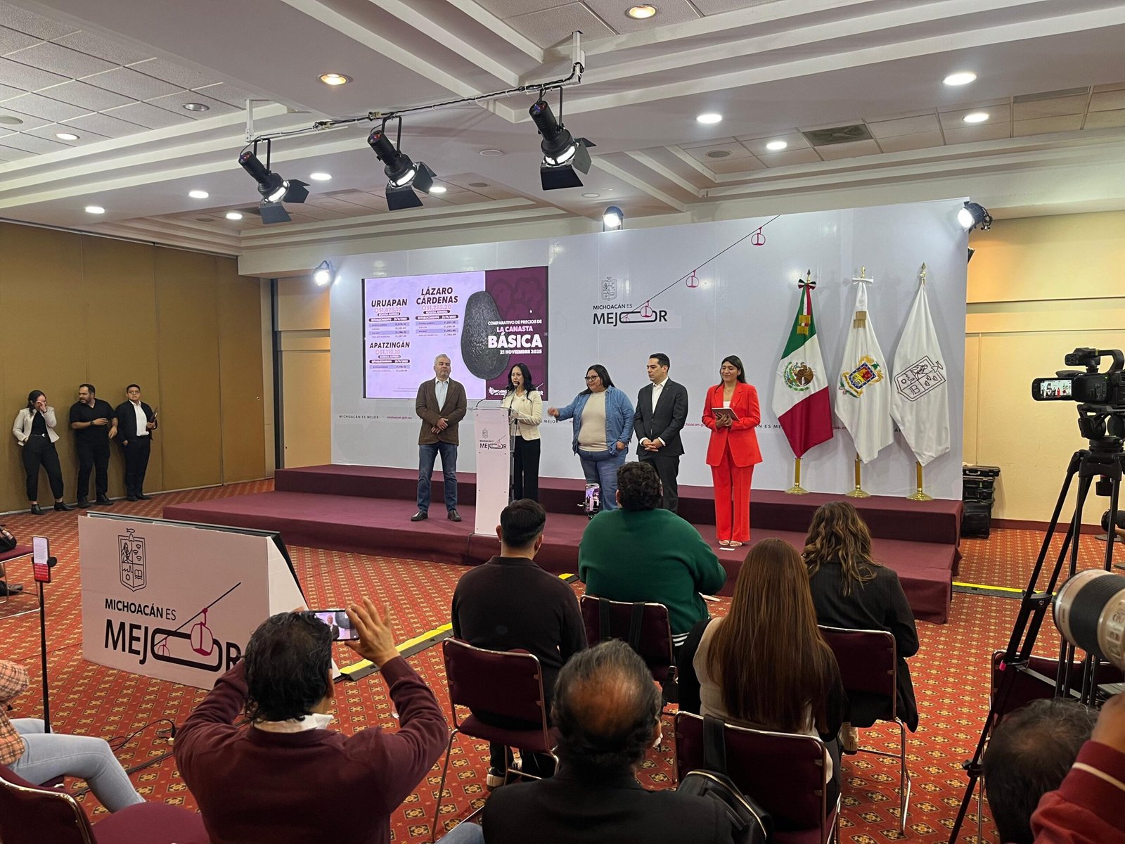 Durante la rueda de prensa encabezada por el gobernador Alfredo Ramírez Bedolla, la subsecretaria del Trabajo y Previsión Social, Laura Yunuen Mejía Béjar (en representación del secretario Claudio Méndez Fernández), detalló que el monitoreo permanente de precios permite identificar variaciones regionales y fortalecer acciones que favorecen la economía familiar.