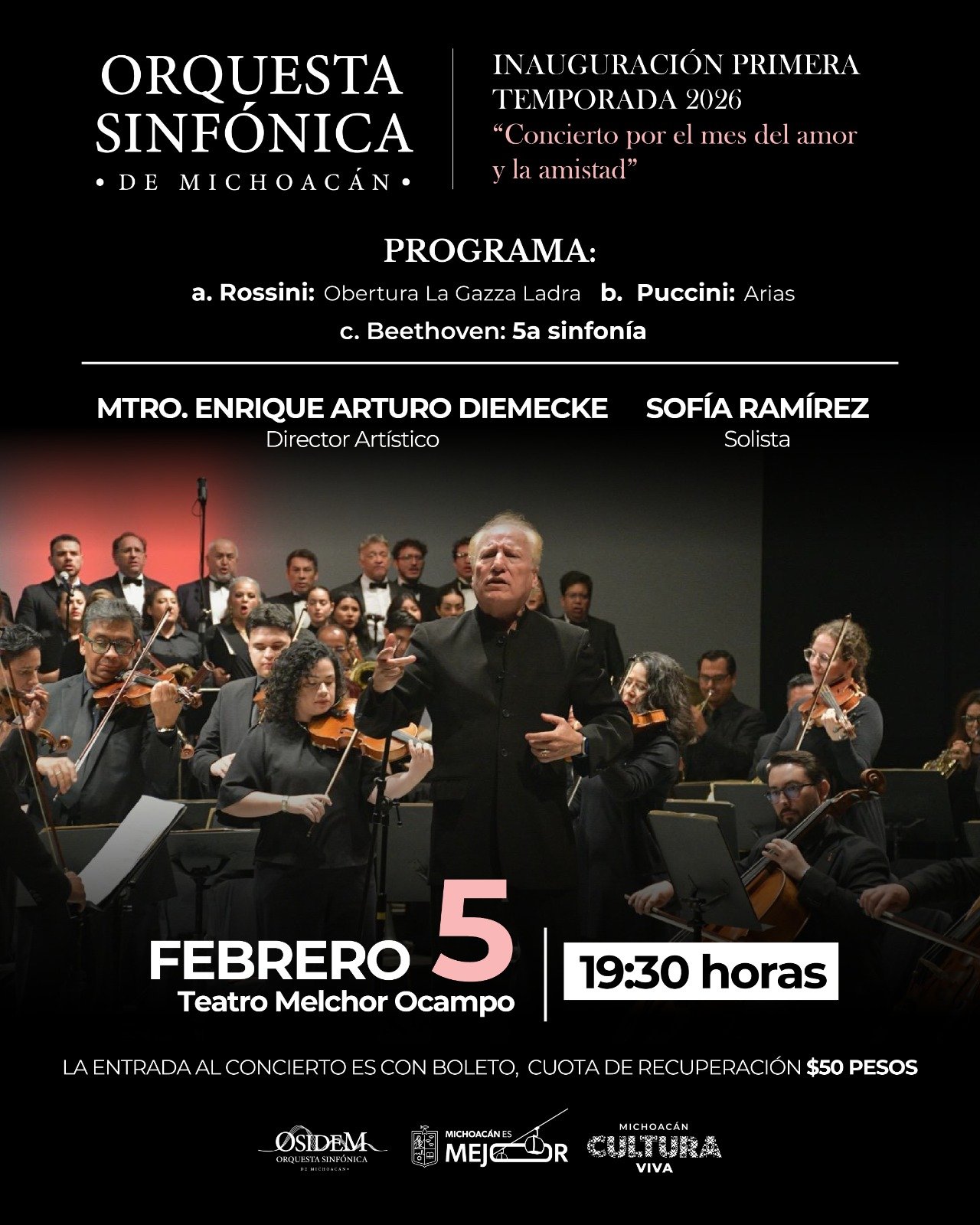 El concierto, titulado “Concierto por el mes del amor y la amistad”, estará bajo la dirección de Enrique Arturo Diemecke y contará con la participación de la soprano Sofía Ramírez. El programa incluirá la obertura de “La Gazza Ladra” de Gioachino Rossini y una selección de arias de Giacomo Puccini de óperas como “Turandot” y “La Bohème”.