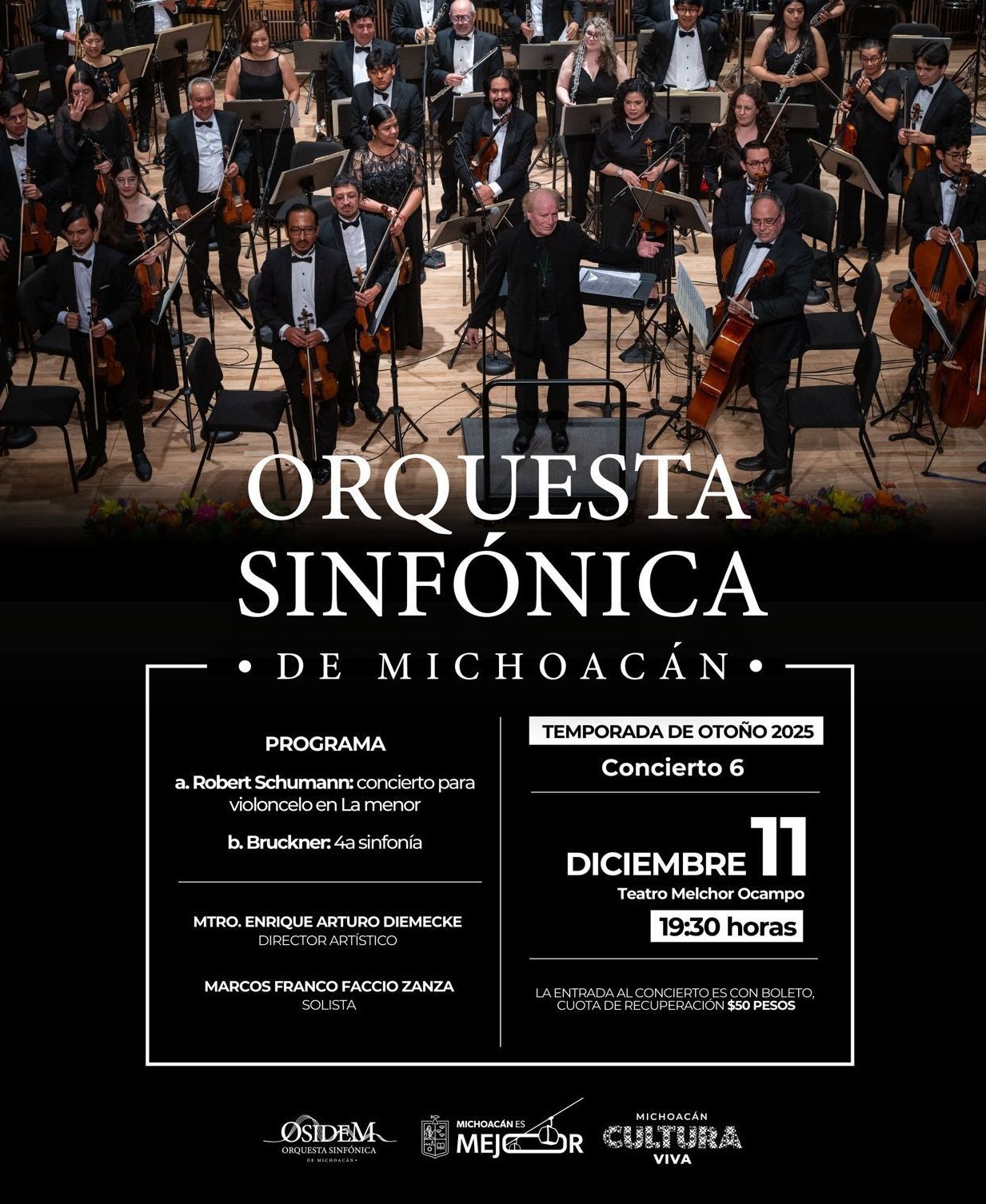 Morelia, Michoacán, 8 de diciembre de 2025.— La Secretaría de Cultura de Michoacán (Secum) invita al sexto concierto de temporada de la Orquesta Sinfónica de Michoacán (Osidem), que se realizará este jueves 11 de diciembre a las 19:30 horas en el Teatro Melchor Ocampo.
