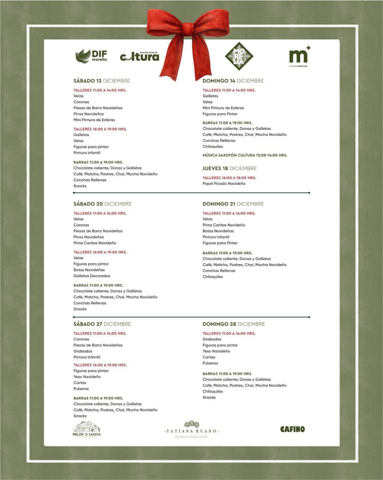 - Talleres creativos: Elaboración de figuras, coronas, esferas, velas decorativas y galletas, con cuotas de recuperación de los 20 a los 200 pesos.