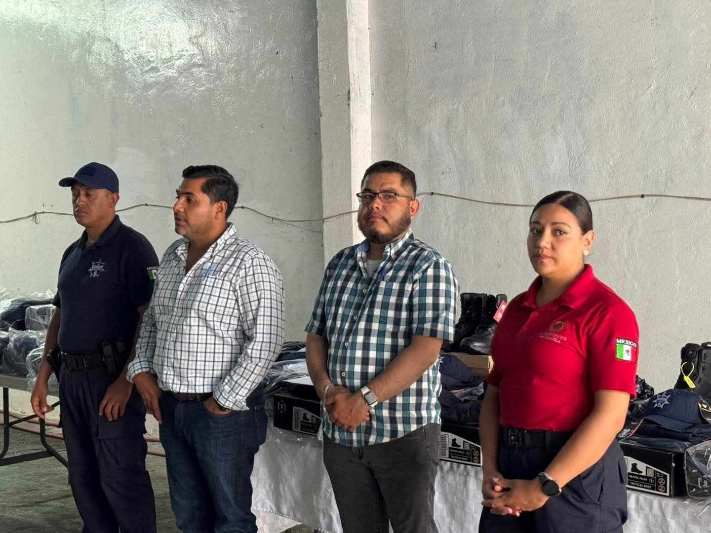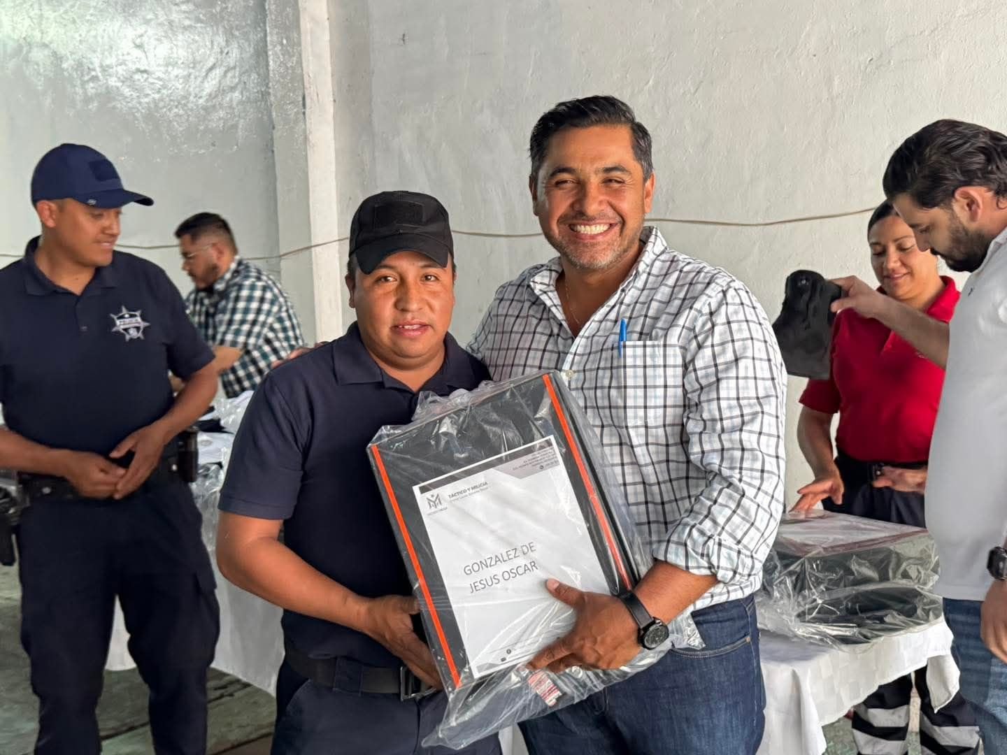 Tuzantla, Michoacán, 21 de abril de 2026. El presidente municipal de Tuzantla, Fernando Ocampo, acompañado del tesorero municipal y el secretario del Ayuntamiento, realizó la entrega de equipo táctico y uniformes al personal de Seguridad Pública y Protección Civil, informó el ayuntamiento.