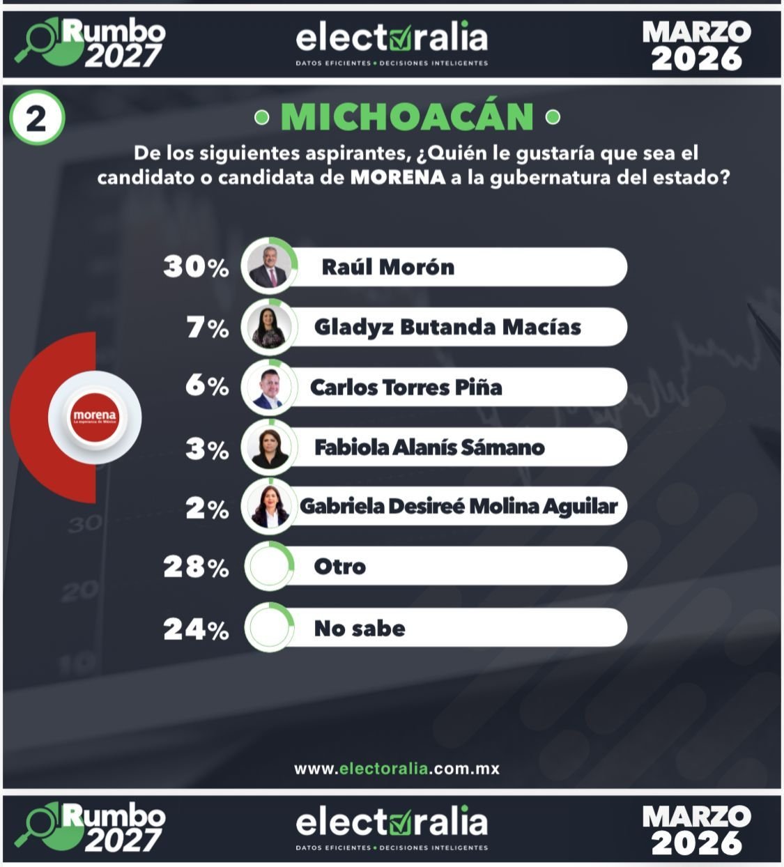 Morelia, Michoacán, 20 de marzo de 2026. El senador Raúl Morón Orozco cuenta con el 30% de las preferencias para ser el candidato de Morena a la gubernatura en 2027, de acuerdo con un estudio realizado por la firma Electoralia.