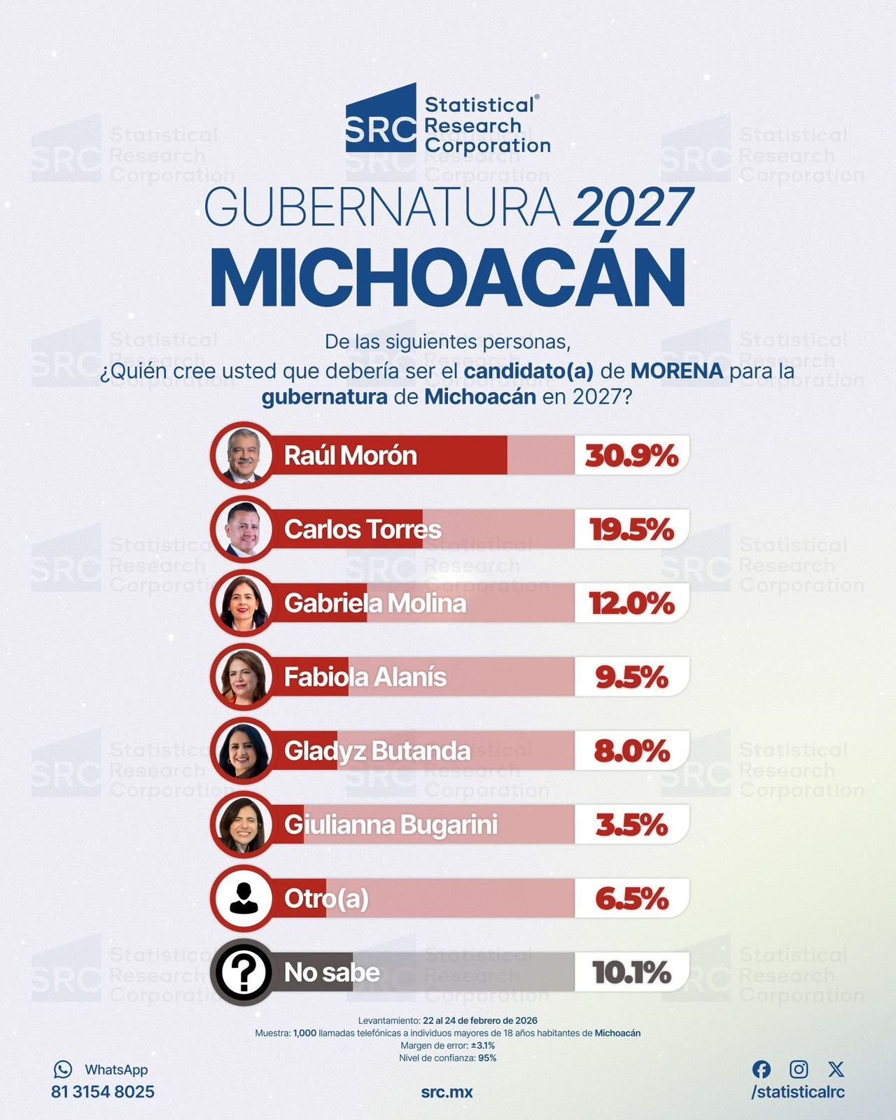 Morelia, Michoacán, 3 de marzo de 2026. El senador Raúl Morón Orozco se mantiene como el aspirante con mayor intención de voto para la candidatura de Morena a la gubernatura de Michoacán en 2027, con una ventaja de dos dígitos sobre sus competidores, de acuerdo con el más reciente estudio de Statistical Research Corporation (SRC) .