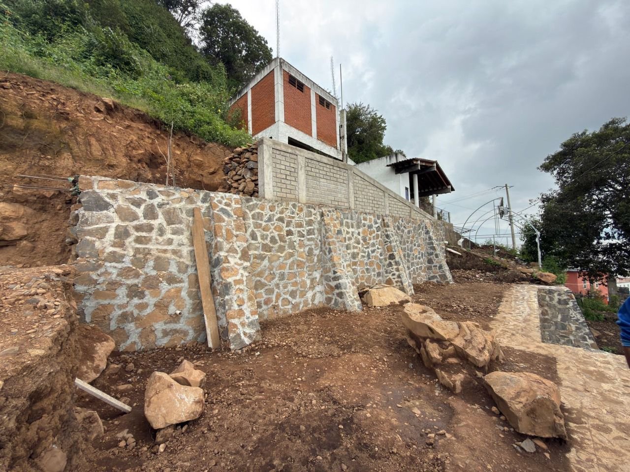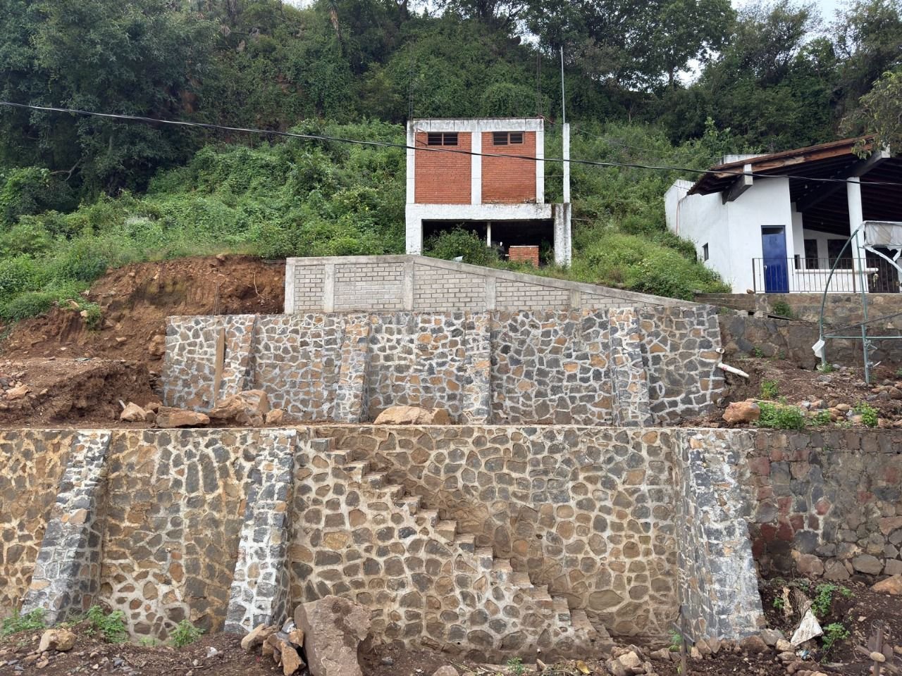 • Muros de contención: Construcción de tres muros de mampostería de piedra con una longitud de 34.69 metros lineales.