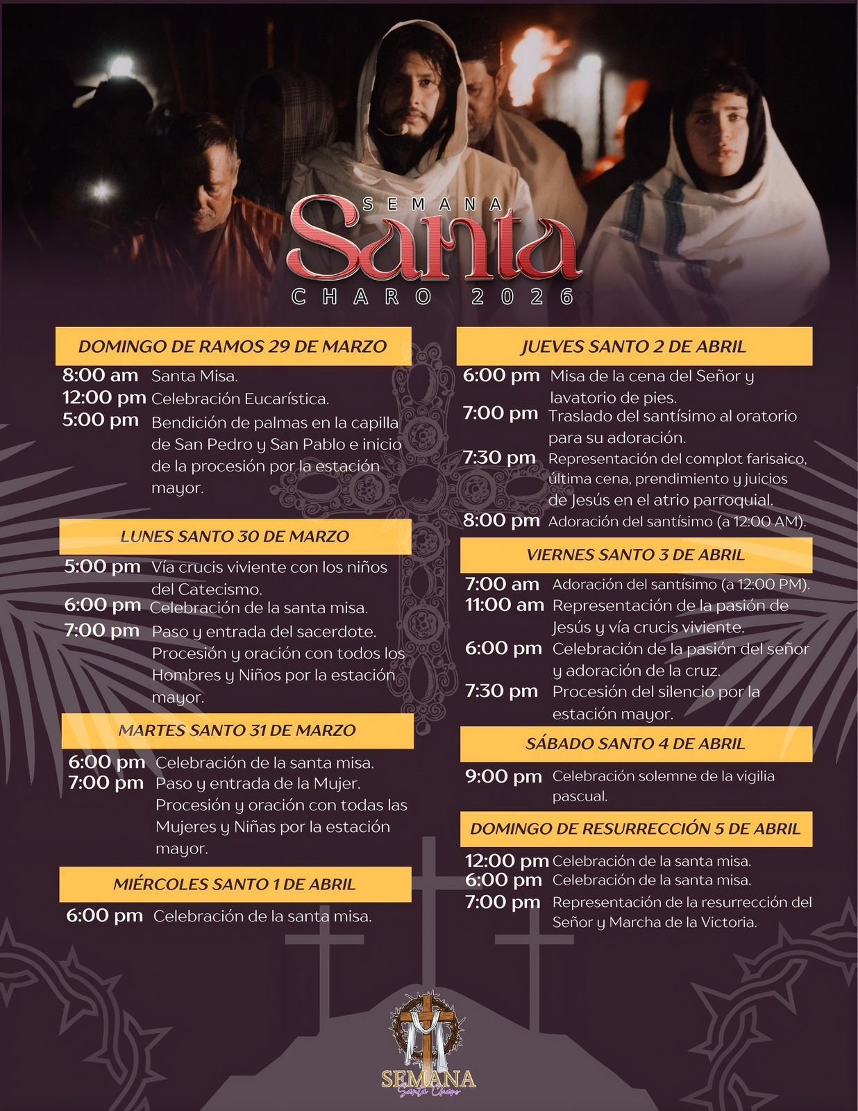 El viernes 3 de abril a las 11:00 horas se realizará la representación de la Pasión de Jesús y vía crucis viviente, y a las 19:30 horas la Procesión del Silencio por la estación mayor. La programación completa se puede consultar en el perfil de Facebook Semana Santa Charo-Oficial.
