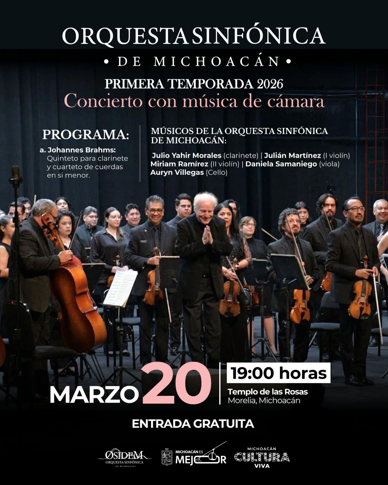 Morelia, Michoacán, 17 de marzo de 2026. La Orquesta Sinfónica de Michoacán (Osidem) ofrecerá un concierto gratuito de música de cámara el próximo viernes 20 de marzo a las 19:00 horas en el Templo de las Rosas, informó la Secretaría de Cultura de Michoacán (Secum) .