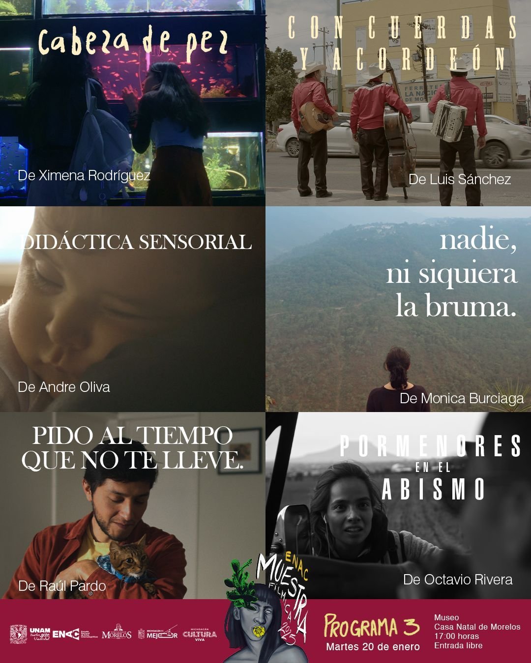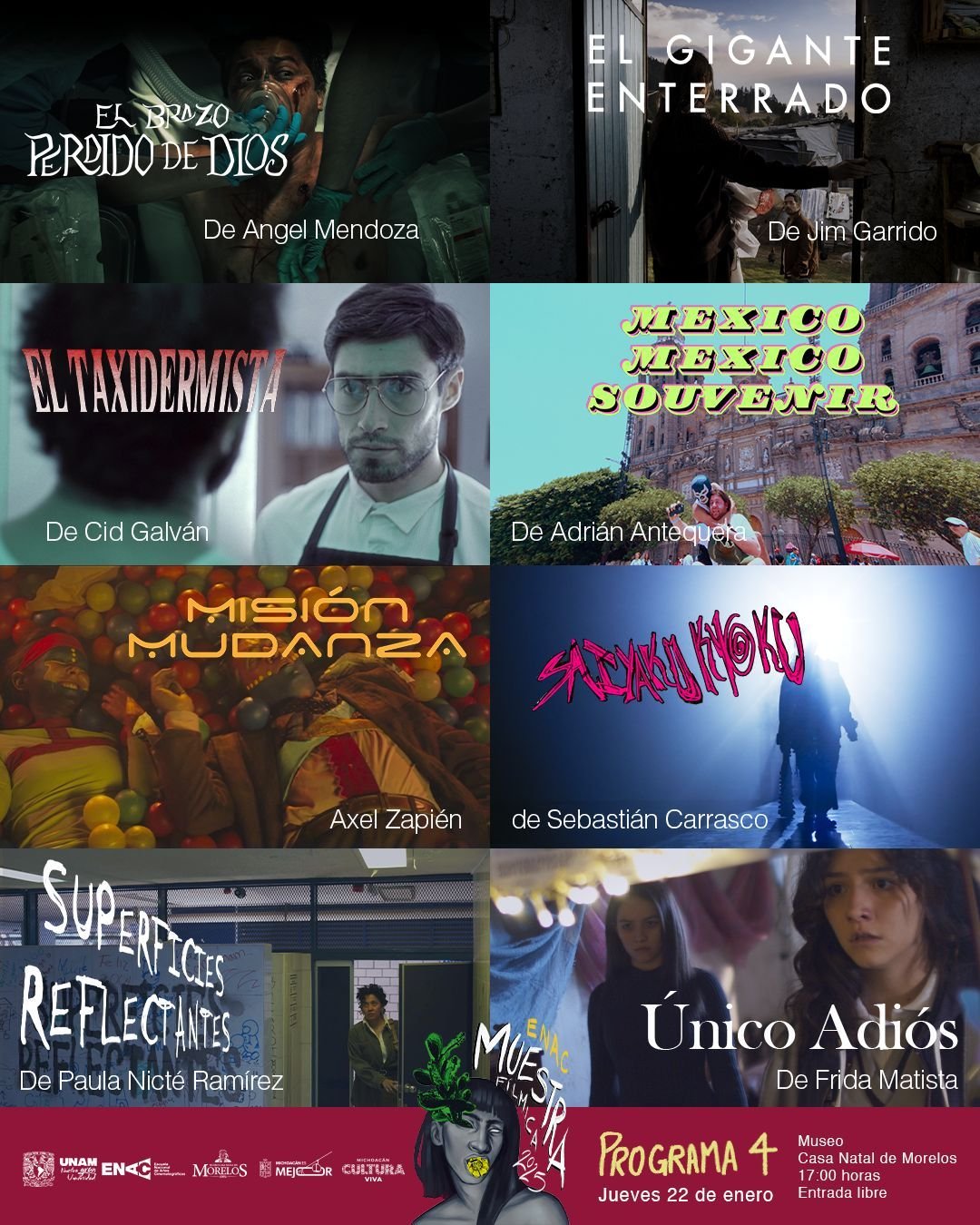 Morelia, Michoacán, 8 de enero de 2026.– La Secretaría de Cultura de Michoacán (Secum) inicia su programación anual en el Museo Casa Natal de Morelos con la Muestra Fílmica de la Escuela Nacional de Artes Cinematográficas (ENAC) de la UNAM. El ciclo de cine comenzará el próximo martes 13 de enero a las 17:00 horas y se extenderá hasta el 27 de enero, ofreciendo al público una selección de trabajos que destacan el talento emergente de una de las instituciones académicas más influyentes del país. La entrada para todas las funciones en el Cine-Club del museo será totalmente gratuita.