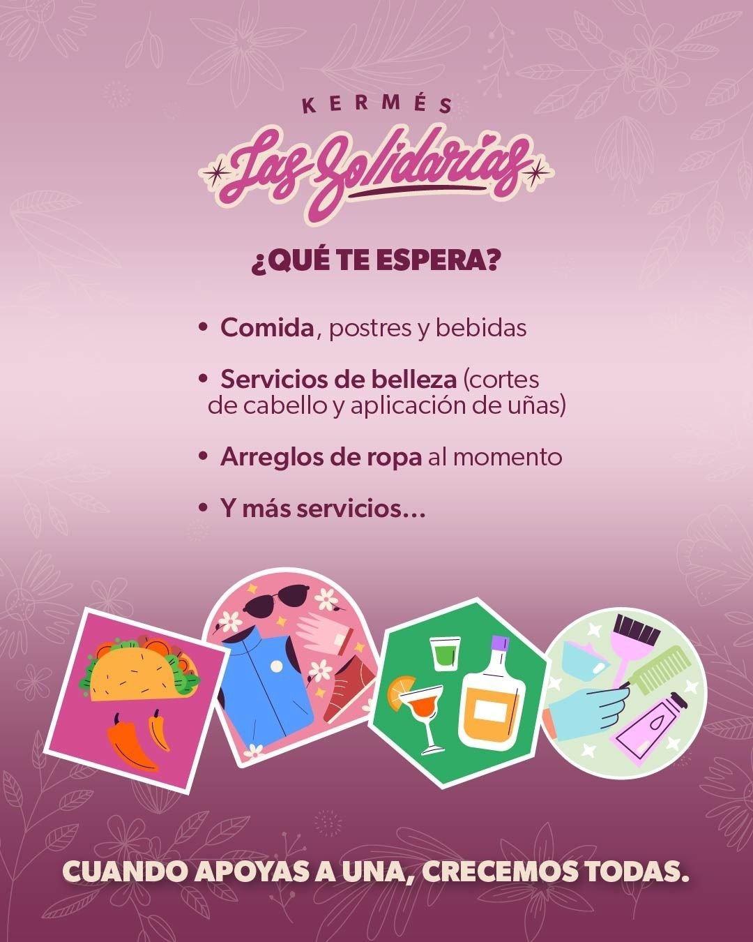 El evento reunirá a 26 mujeres emprendedoras que recibieron kits de autoempleo en rubros como uñas, belleza, repostería, costura y confección. Las participantes ofrecerán directamente sus productos y servicios a la comunidad, incluyendo antojitos y postres, cortes de cabello, aplicación de uñas, arreglos de ropa y productos artesanales.