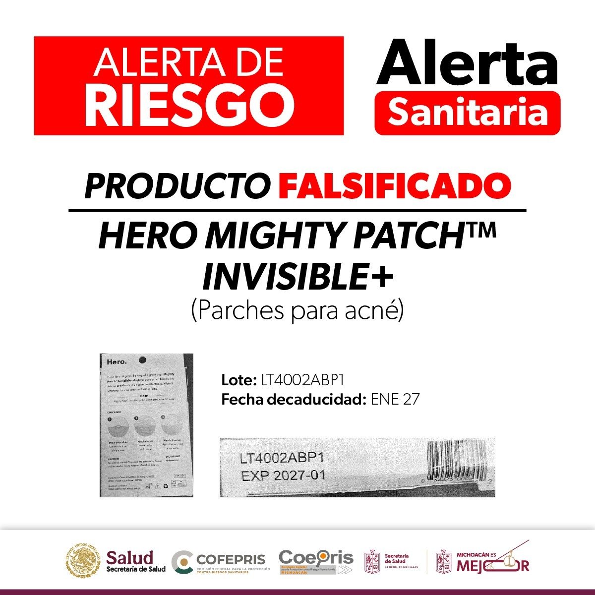Morelia, Michoacán, 27 de enero de 2026.– La Secretaría de Salud de Michoacán (SSM), en coordinación con la Comisión Federal para la Protección contra Riesgos Sanitarios (Cofepris), emitió una alerta sanitaria por la comercialización ilegal del producto Hero MIGHTY PATCH™️ Invisible+ (Parches para acné), según informó la dependencia estatal.