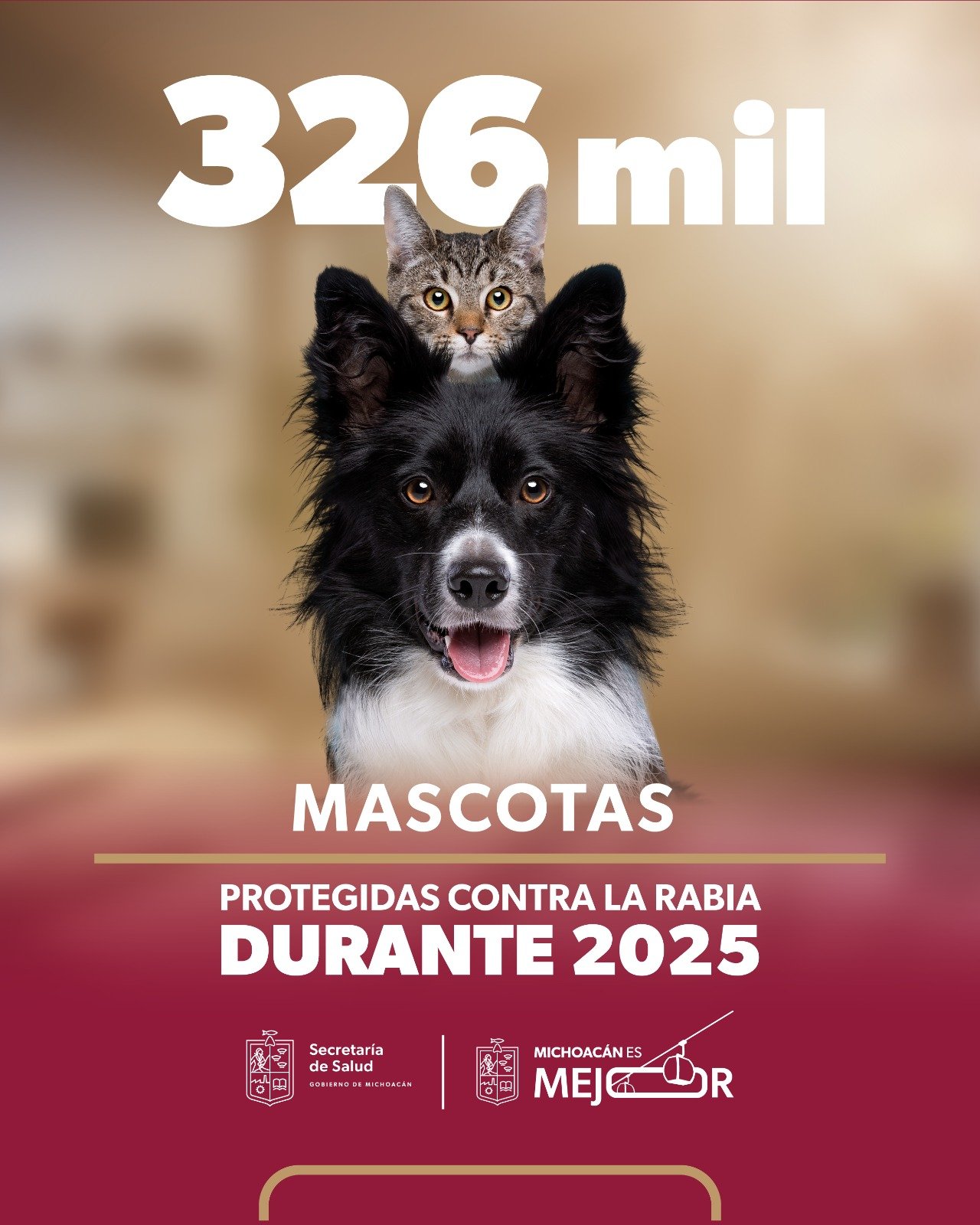 Morelia, Michoacán, 5 de enero de 2026.– La Secretaría de Salud de Michoacán (SSM) informó que, como parte de las acciones de control de zoonosis, durante el año 2025 se aplicaron 326 mil 400 dosis de vacuna antirrábica a perros y gatos en la entidad. Estas acciones preventivas permitieron mantener al estado libre de casos de rabia humana transmitida por animales de compañía.