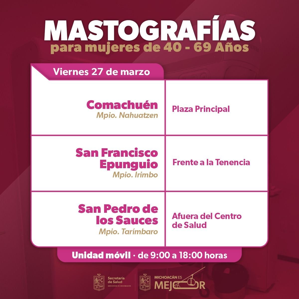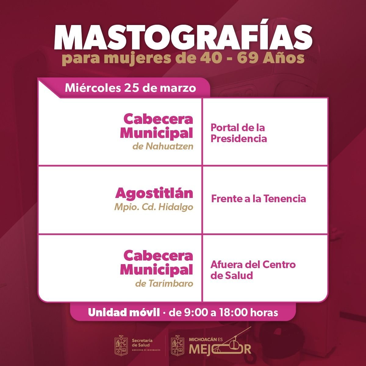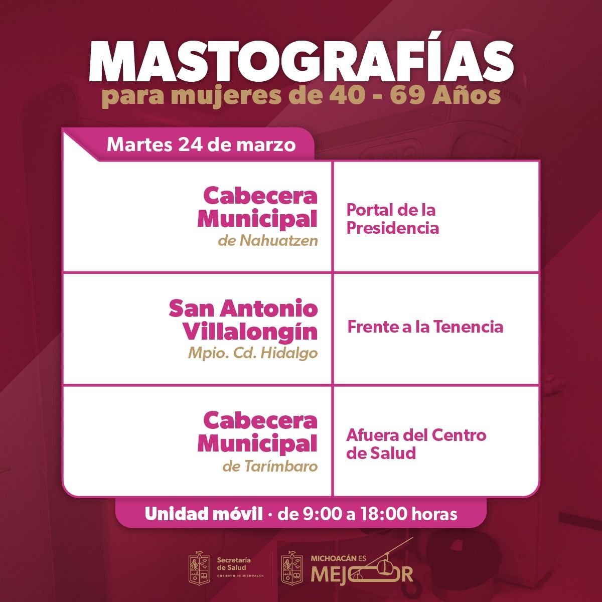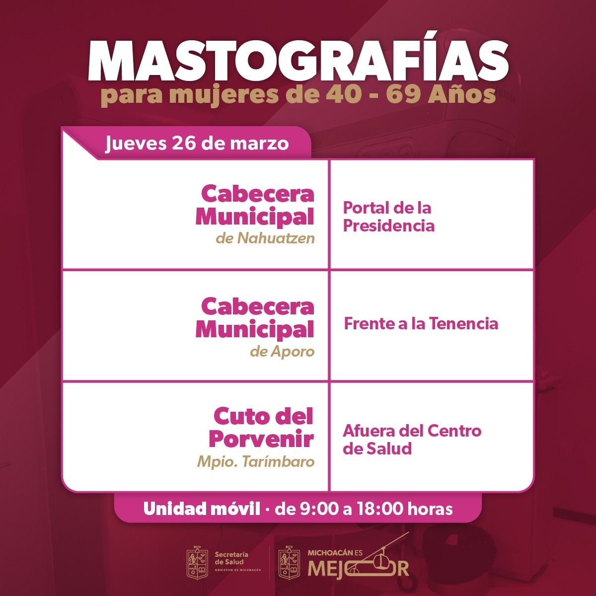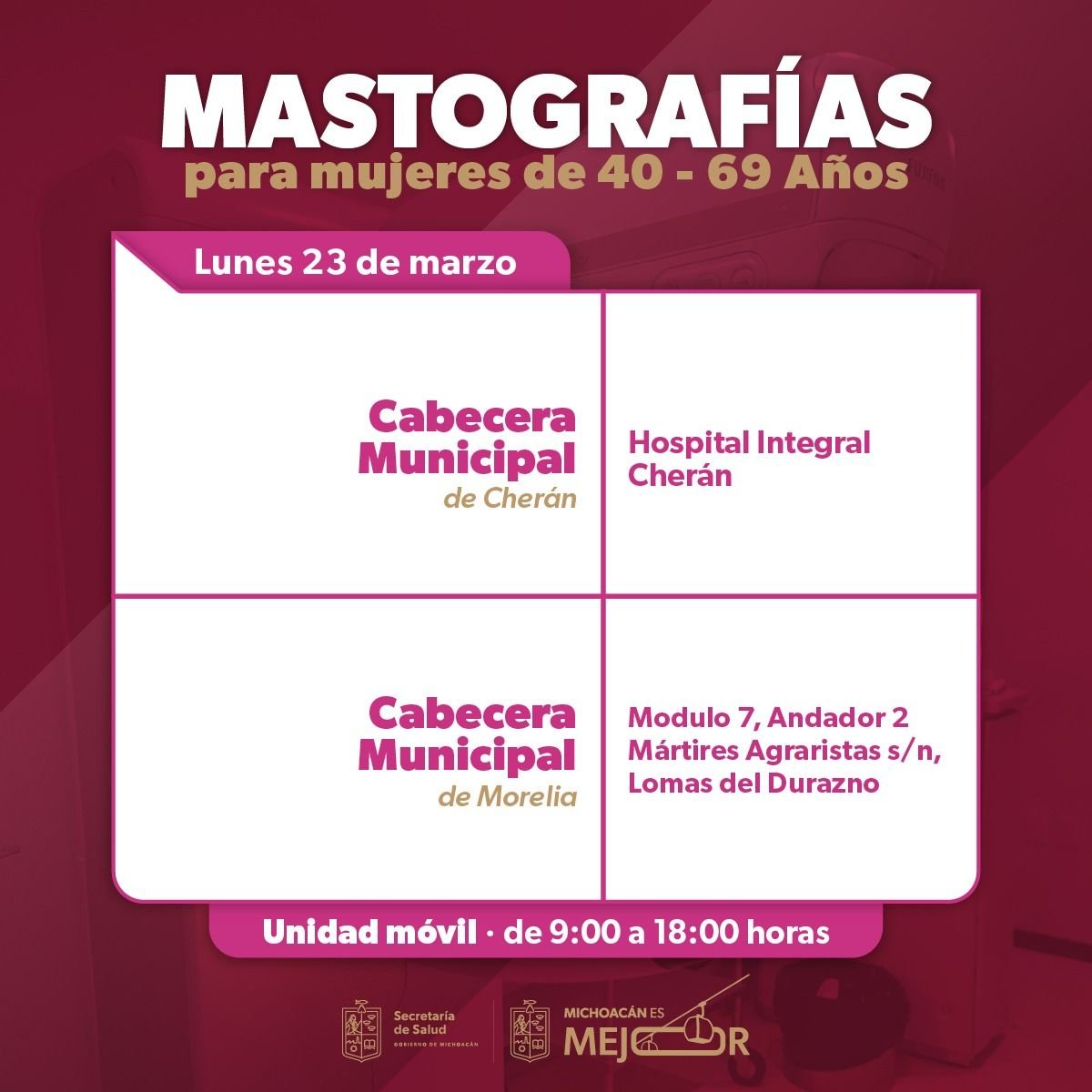 Morelia, Michoacán, 23 de marzo de 2026. La Secretaría de Salud de Michoacán (SSM) desplegará sus unidades móviles de mastografía durante la semana del 23 al 27 de marzo para fortalecer la detección oportuna del cáncer de mama, informó la dependencia.