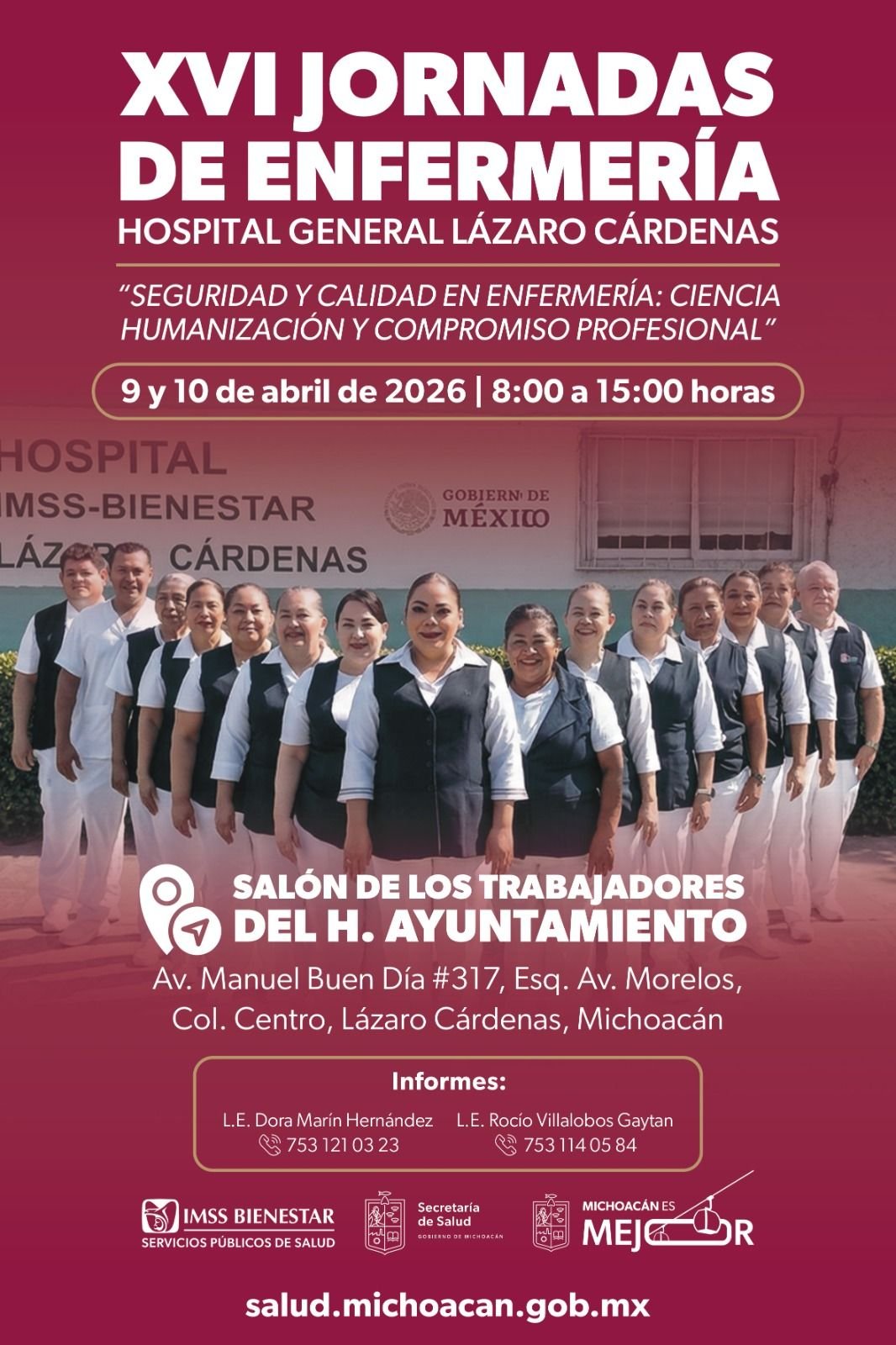 Morelia, Michoacán, 7 de abril de 2026. El Hospital General de Lázaro Cárdenas de la Secretaría de Salud de Michoacán (SSM) llevará a cabo las 16 Jornadas de Enfermería los próximos 9 y 10 de abril, con el objetivo de fortalecer la cultura de la seguridad y calidad en el servicio.