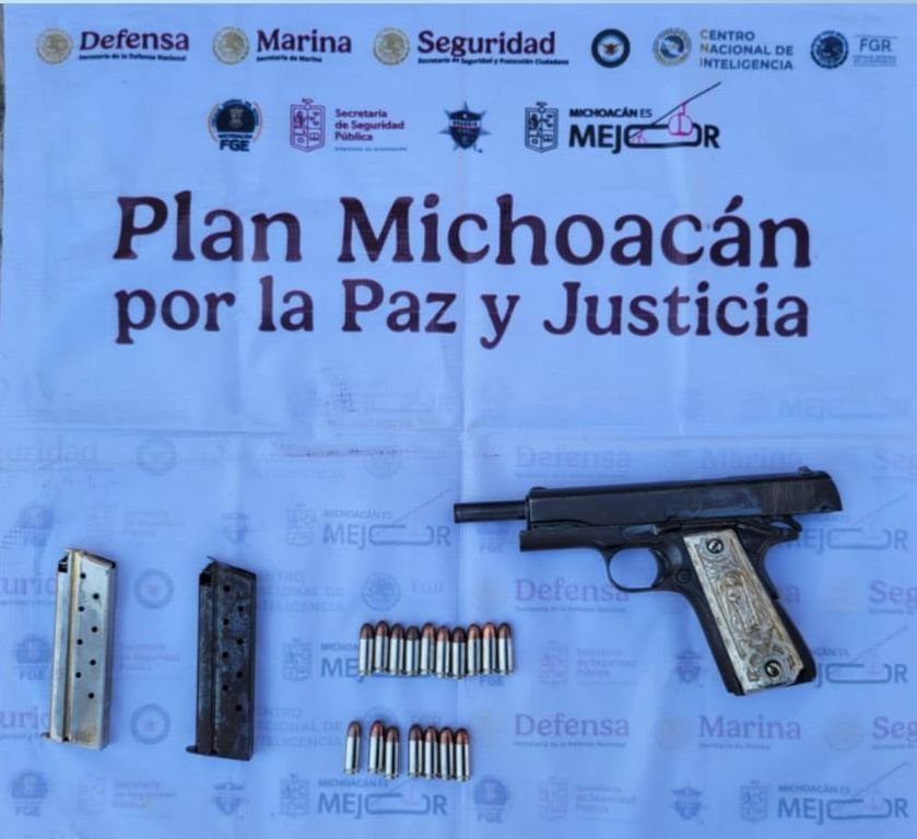 - Apatzingán: En la localidad de Cenobio Moreno, se aseguró una pistola calibre .38 mm, cargadores y municiones hallados dentro de un vehículo Nissan.