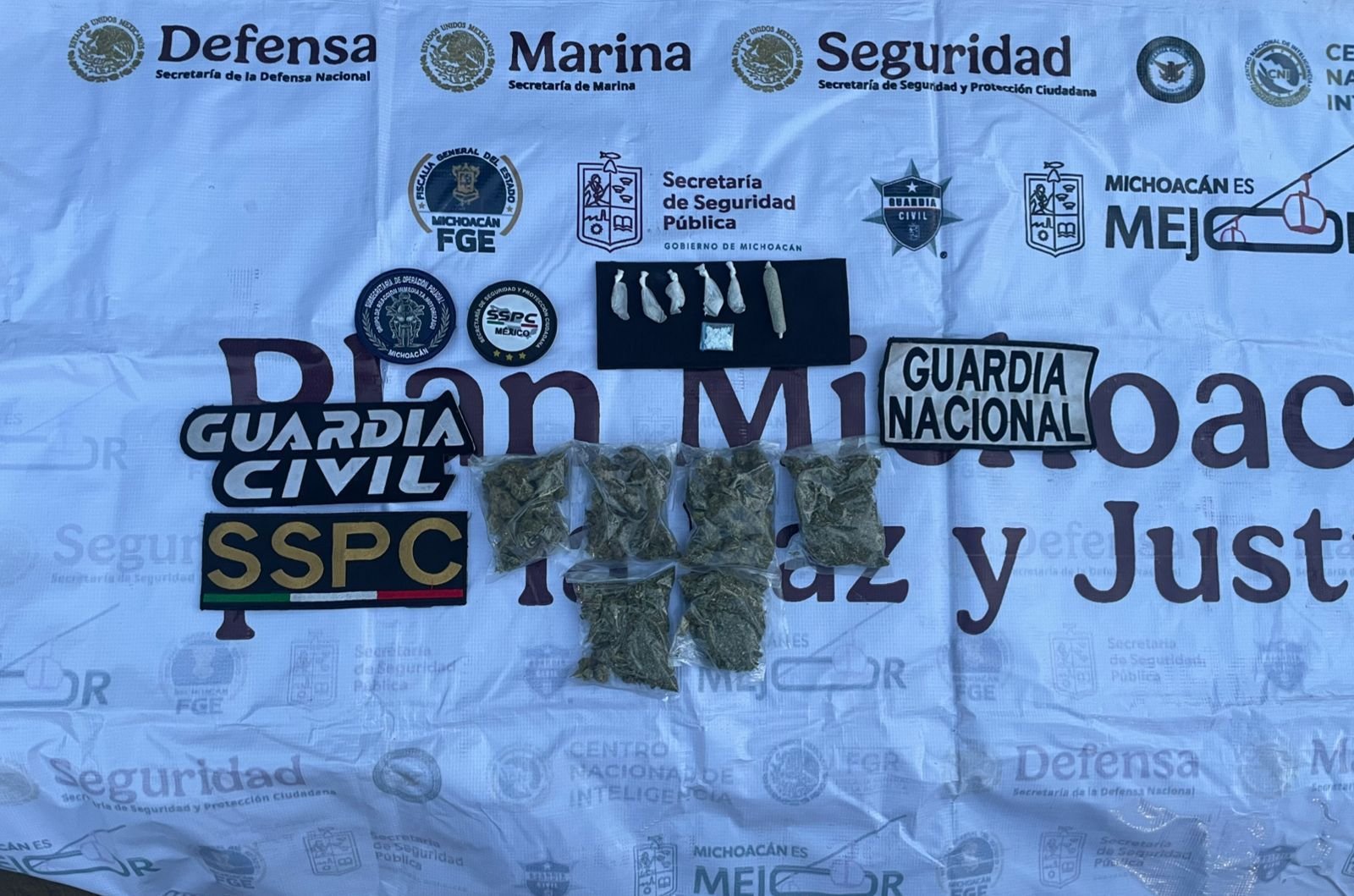 En el municipio de Uruapan, elementos de la Guardia Civil, la Secretaría de Seguridad y Protección Ciudadana (SSPC) y la Guardia Nacional aseguraron a un adolescente. Se le decomisaron seis dosis de hierba verde y seca, cinco de metanfetamina y un envoltorio de sustancia blanca polvorienta, según el reporte.