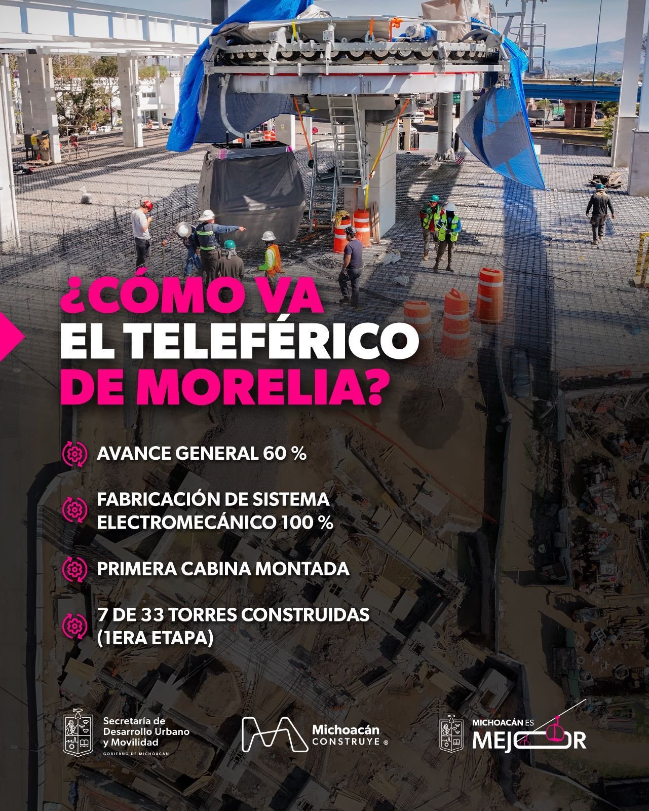 Morelia, Michoacán, 8 de diciembre de 2025.— La construcción del teleférico de Morelia registra un avance general del 60 por ciento, informó la secretaria de Desarrollo Urbano y Movilidad (Sedum), Gladyz Butanda Macías, en conferencia de prensa encabezada por el gobernador Alfredo Ramírez Bedolla.